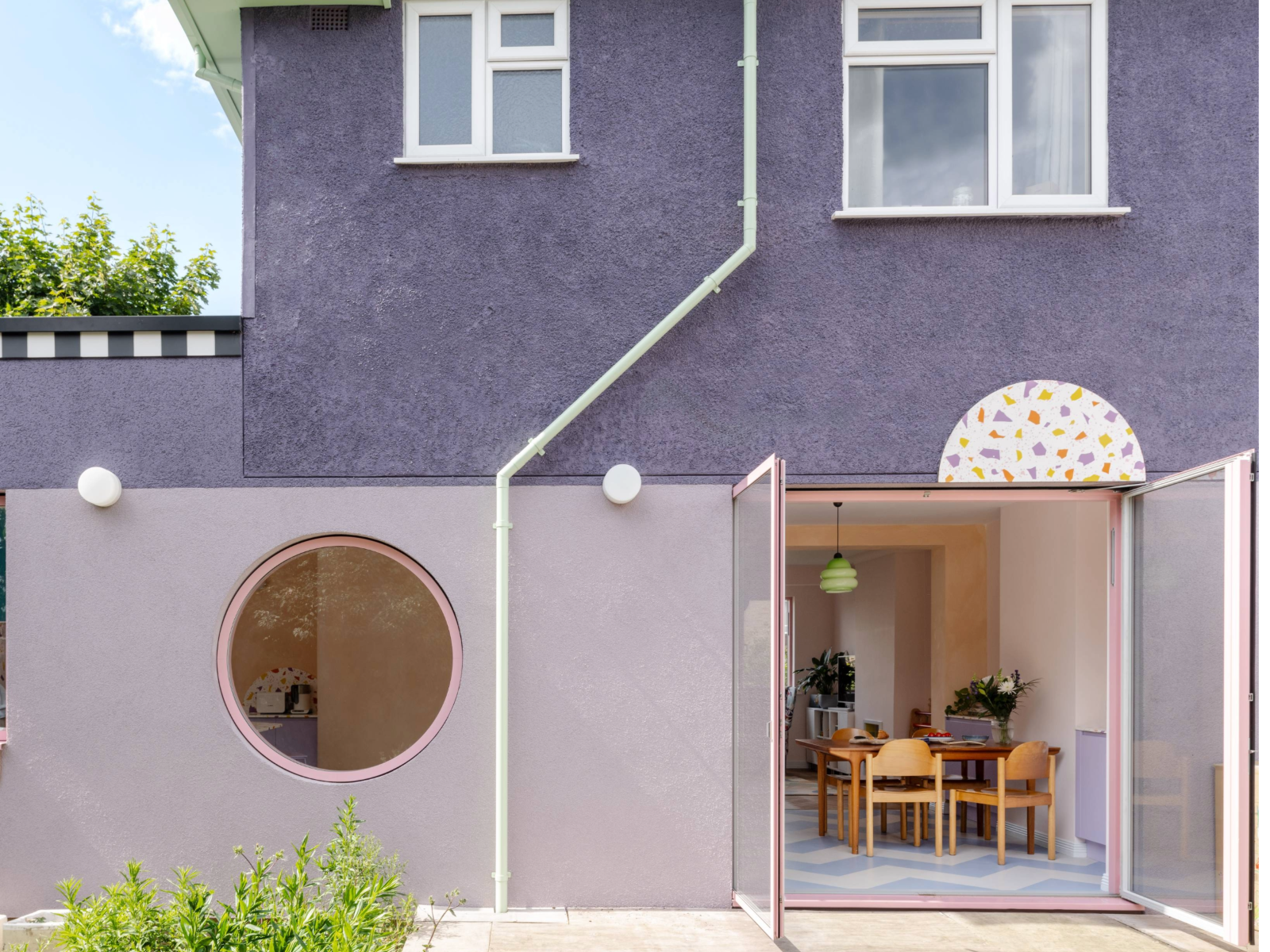 Externally, the home was finished with pastel lilac render, complemented by mint-green drainage pipes, checkerboard tiles and a curved pink porch idea. The couple were able to live off-site during the project, staying with Mike’s mum, but they regularly dropped by to keep an eye on progress and were heavily involved in the selection of materials, finishes and colours.