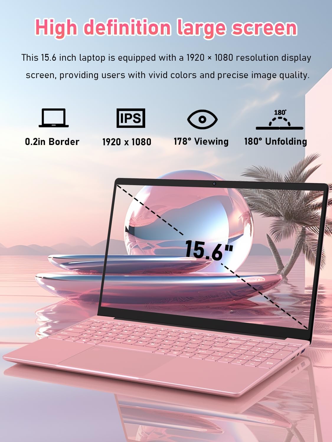 Display: 15.6″ Full HD (1920 × 1080) IPS screen with a 0.2 in narrow bezel and 180° hinge; powered by UHD Graphics (16 EU at up to 1.20 GHz) supporting up to three 4K @ 60 Hz external displays for vibrant visuals and flexible viewing angles