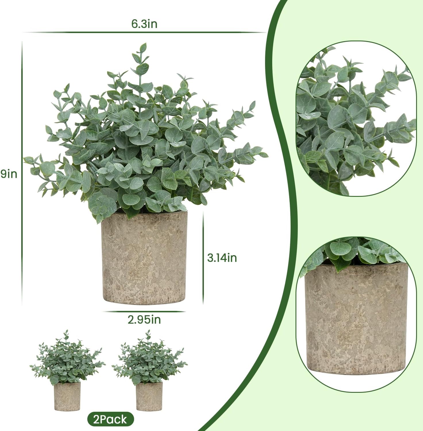 Small Size & Adjustable Shape: This set includes 2 small artificial eucalyptus plants, each measuring approximately 9 inches in total height (from the top of the plant to the bottom of the pot) and 6.3 inches in width when the leaves are fully spread. The gray paper pulp pots are about 2.95 inches wide and 3.1 inches tall. You can gently adjust the leaves to achieve your desired shape and fullness. NOTE: The leaves may be slightly compressed during shipping — simply reshape them by hand to restore their natural appearance