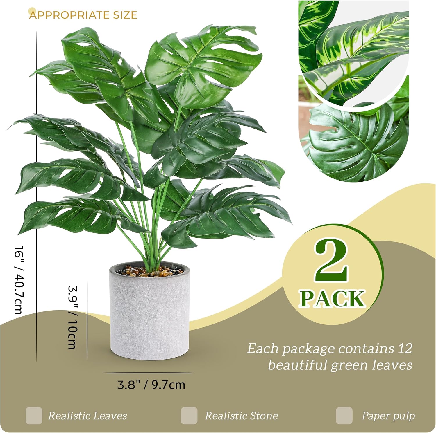 Size & Quantity: You will get 2 packs medium fakes plants.Each faux plant has about 12 leaves.Plant:16″~10.2″ Pot: 3.9″~3.7″.The pot is nice and heavy ,it won’t blow over in the wind if you put it on the balcony