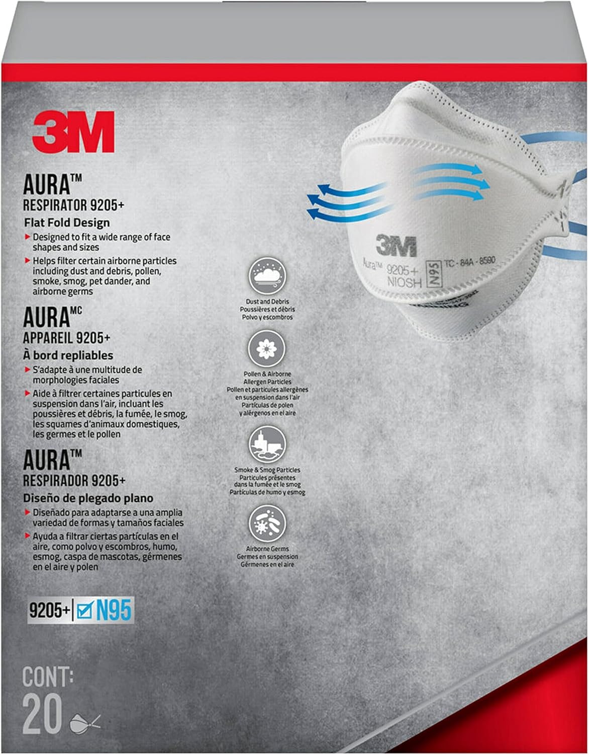 3M Aura Particulate Respirator 9205+ is an N95 disposable particulate respirator that is designed to help provide respiratory protection of at least 95 percent filtration efficiency against certain non-oil based particles. The lightweight, three-panel designed respirator helps provide comfortable and convenient respiratory protection. 3M uses a variety of innovative technologies and features to help you meet your respiratory protection and comfort needs. 3M`s proprietary filter media, 3M Advanced Electret Media, filters dust and other airborne particles, while allowing for easy breathing. The soft inner material provides added comfort and the adjustable nose clip help provide a custom seal.