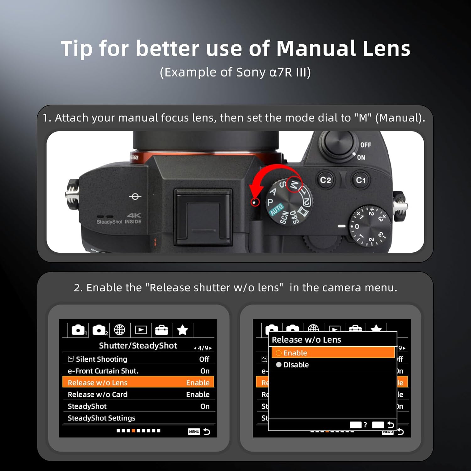【Tip for better use of Manual Lens】Switch the camera to full manual (M) mode immediately after installation, otherwise the “No lens” error may be triggered. If the error persists, you must enable the “Release shutter w/o lens” option in the camera menu (common on Nikon and Sony models)