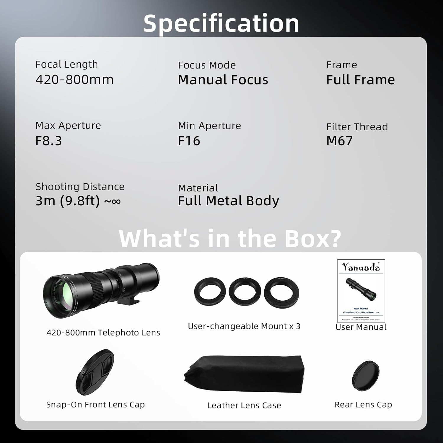 【Multi-Mount Versatility】Yanuoda lens is designed with 3 types of T-mount adapter rings, including Canon EF/EF-S, Nikon F, and Sony E mounts, for seamlessly switching between cameras