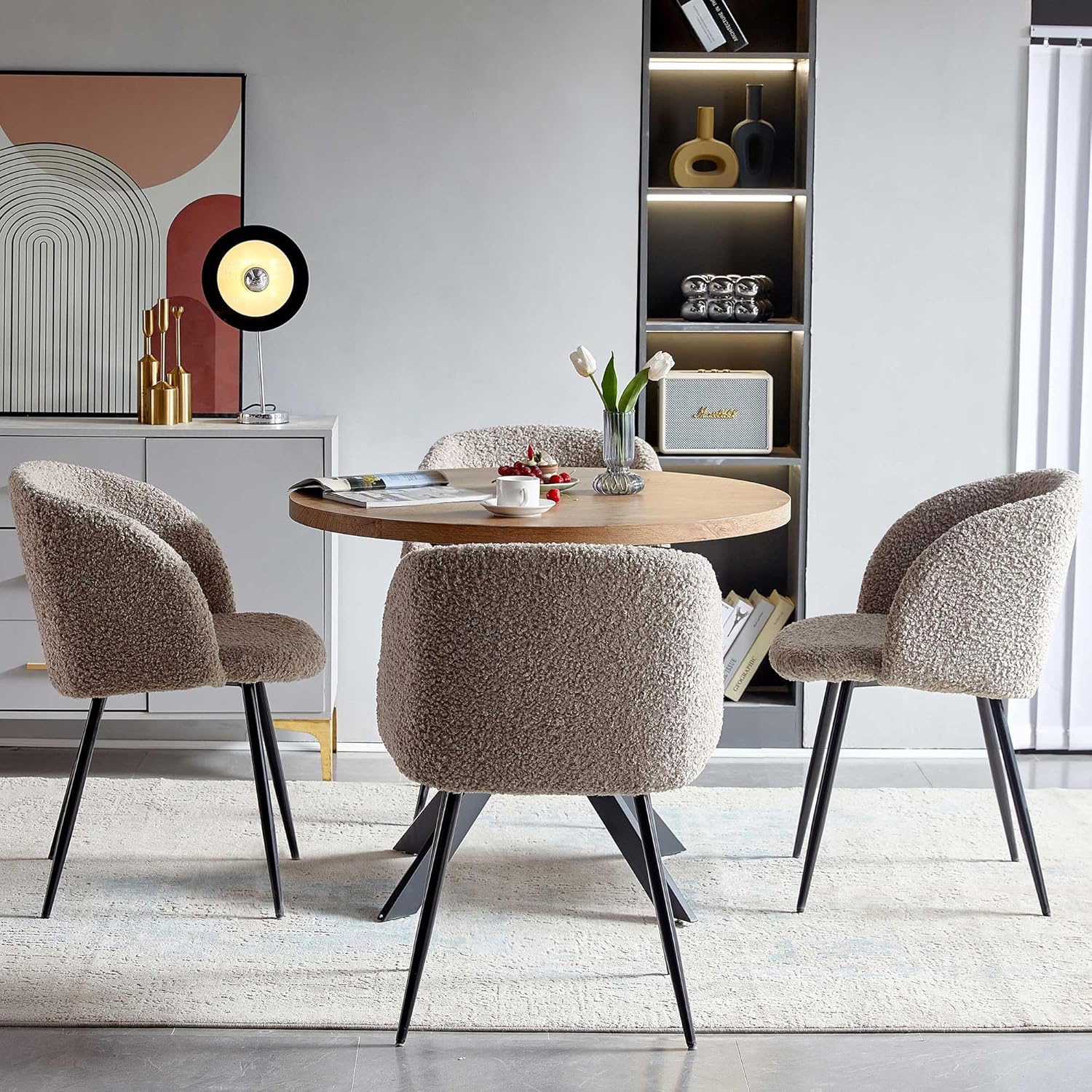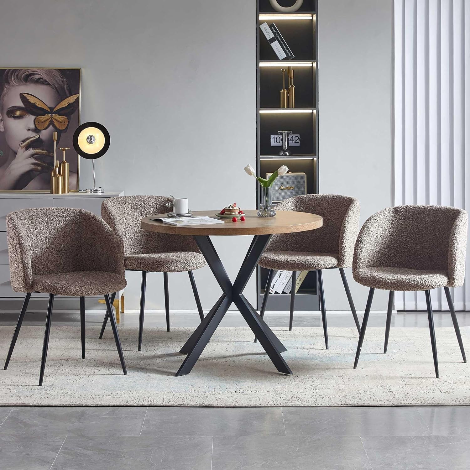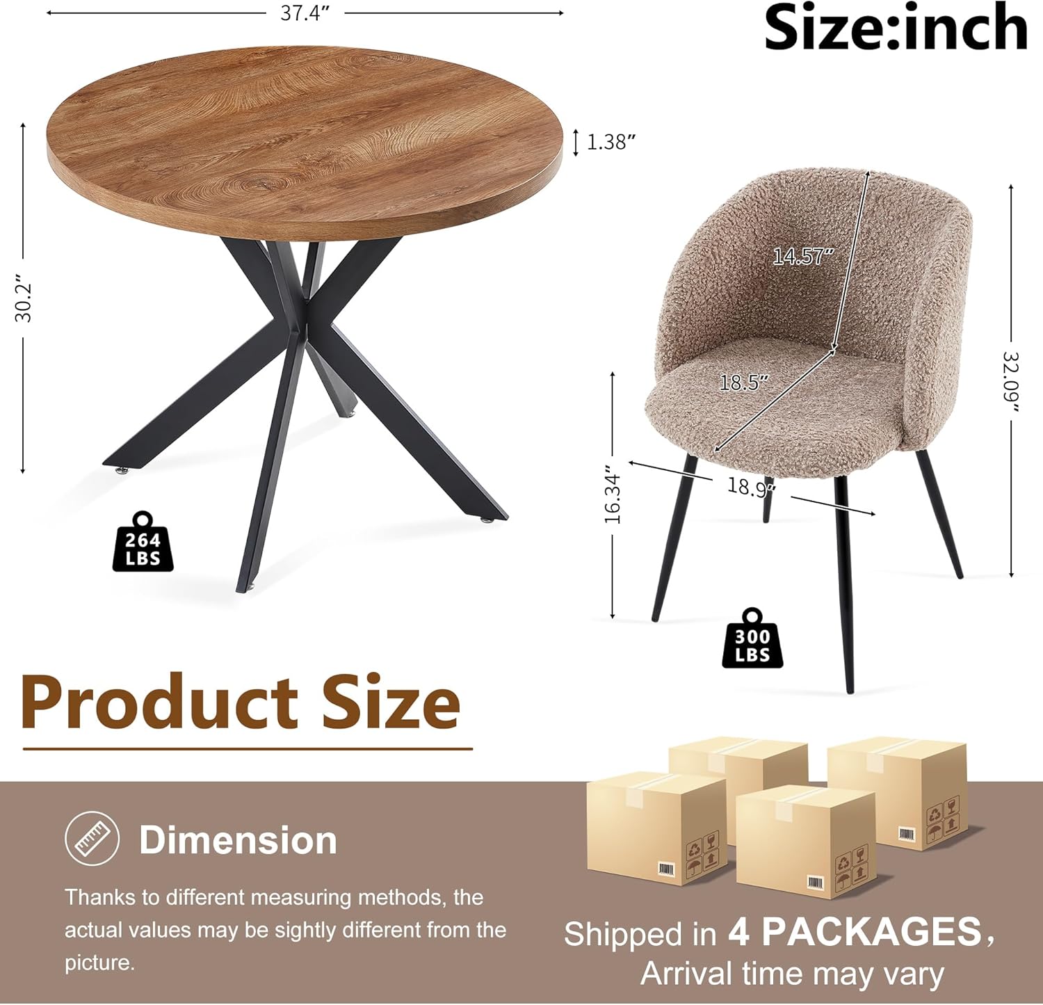 【Modern Round Dining Table Set for 4】: This 5-piece dining table set includes a round table with a vivid imitation natural wood grain tabletop,and 4 fluffy faux fur armchairs with mid-back.Beautifully finished engineered wood tabletop with a stable intersecting pedestal metal base&legs design to provide a modern and chic atmosphere to your room and act as a central point. Non-slip legs cover add stability to keep this table set stable,also prevent floor or carpets from scratches.
