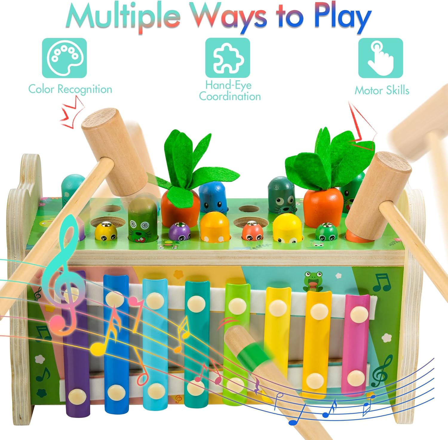 【EDUCATIONAL MONTESSORI TOY】An early development toy to participate in baby’s growth, mole-tapping exercises eye-hand coordination, magnetic woodpeckers aiming worms to develop fine motor skills, quick reaction & logical thinking skills, two hammers & mallets to share to help improve social skills, xylophone playing develop musical perception-Just like a real musician!