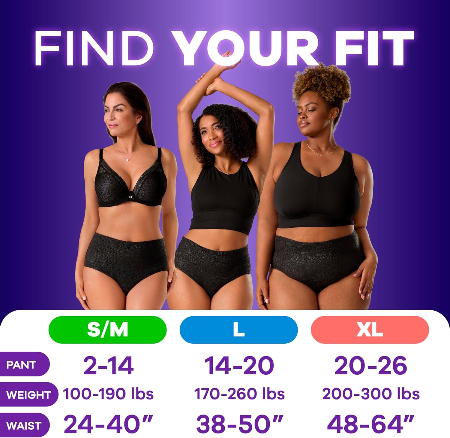 DESIGNED TO FIT ALL KINDS OF CURVES from dress/pant sizes 2-26W+. Find your fit on the Always Discreet My Fit size chart