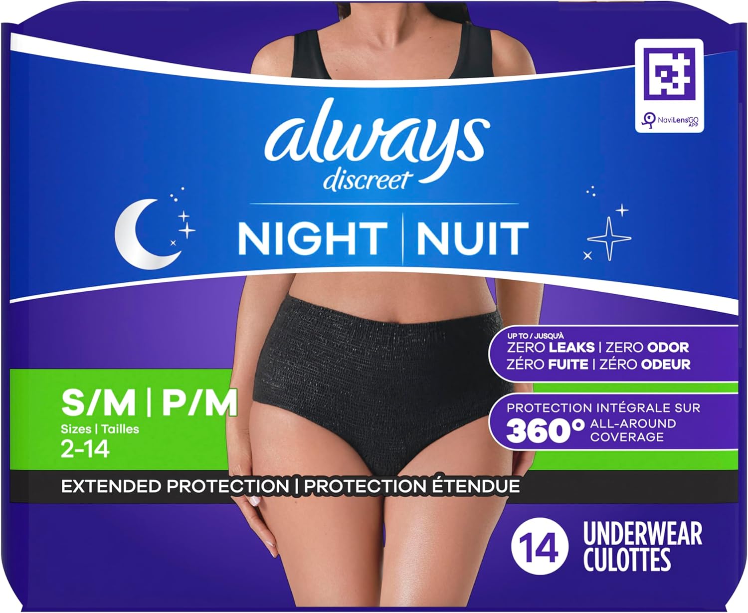 Finally, long-lasting Overnight bladder leak protection that feels as good as it looks. Say ‘never again’ to bulky adult diapers and ‘hello’ to Always Discreet disposable incontinence underwear for women with a smooth and secure fit that looks and feels like real underwear. The form-fitting design of Always Discreet Incontinence and Postpartum Underwear for women hugs your curves with a soft, silk-like fabric so you can walk with poise and confidence. It’s the delicate, barely noticeable look you want in disposable panties for women, paired with the leak-proof protection you deserve. The super absorbent core turns liquid to gel to stop bladder leaks in seconds for up to 12 hours of reliable overnight leak-free protection. Exclusive OdorLock Technology neutralizes odors instantly and continuously, to help you feel confidently fresh and dry all day long. Unexpected leaks don’t stand a chance with the special side LeakGuard design that helps stop bladder leaks at the leg, where they happen most. Get incredible protection with the disposable underwear women can depend on. Specially designed to fit all kinds of curves, Always Discreet Incontinence Underwear is available in sizes Small / Medium – Large / Extra Large, so you’ll be sure to get the protection you deserve with Always Discreet incontinence and postpartum underwear. Incontinence panties for women ship discreetly and are available in bulk. *Absorbs faster vs. leading night brand, supported by studies conducted by Always Discreet November 2024