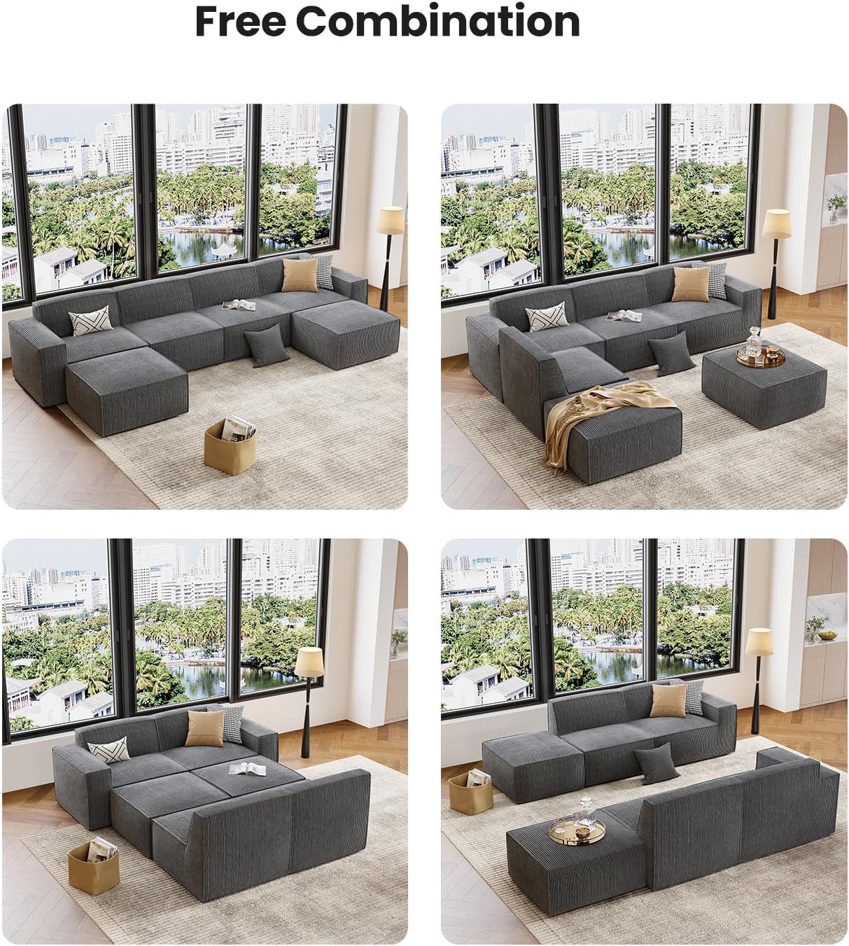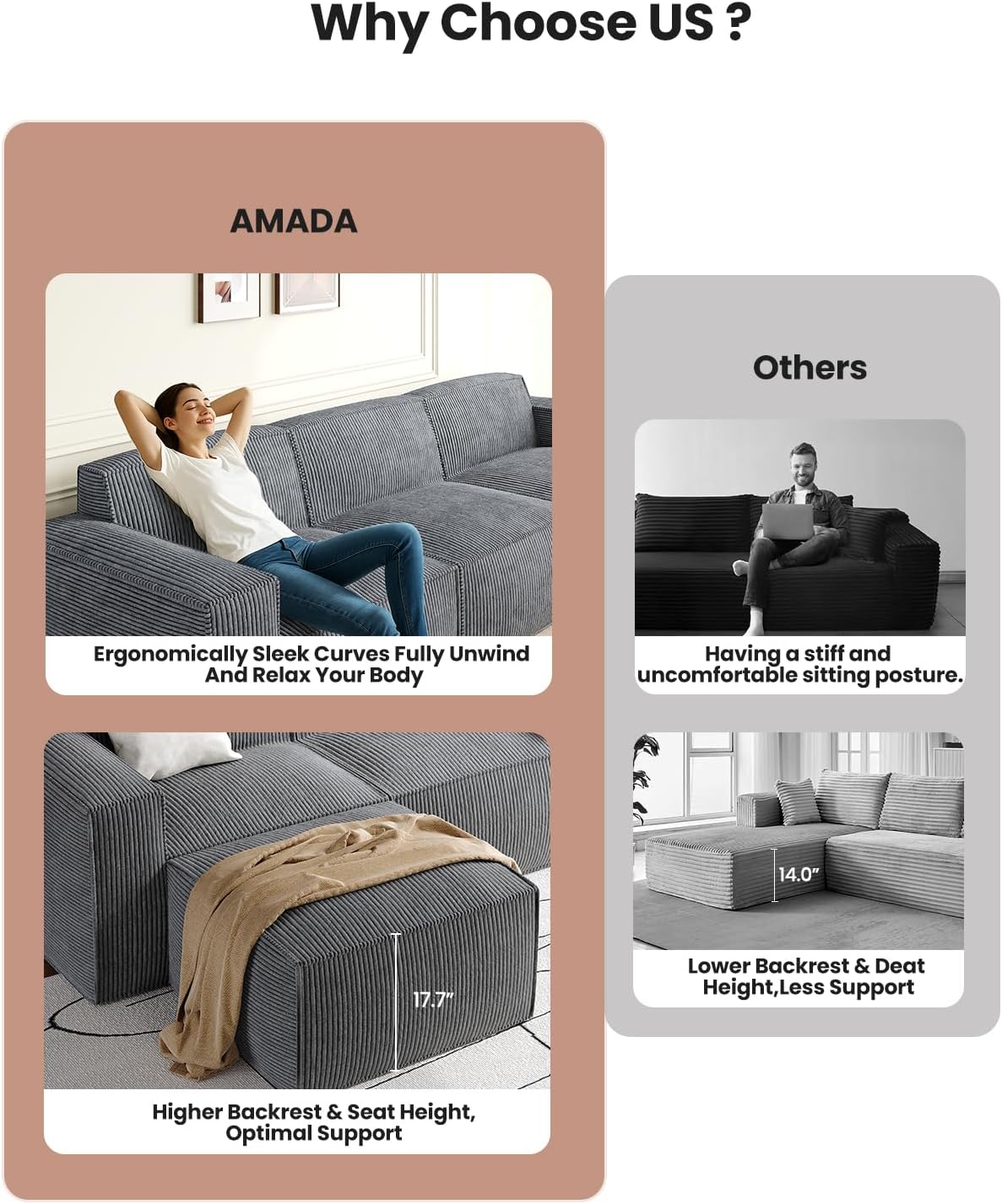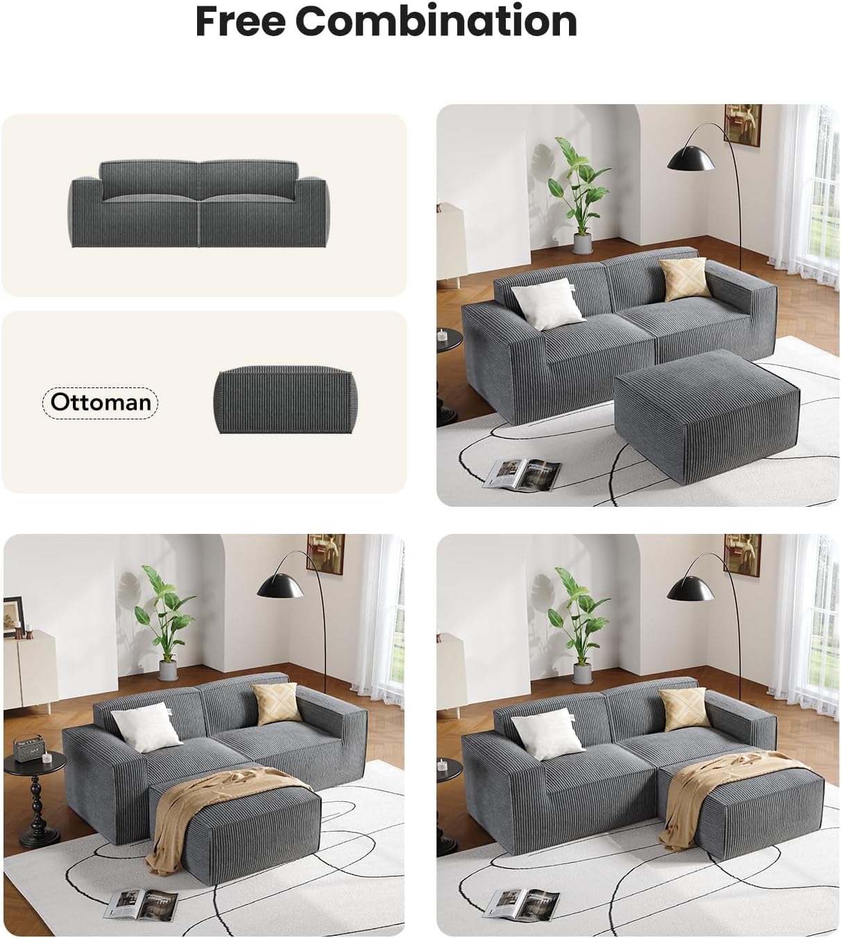【Stronger Support & Spacious Seat】With a 20% higher backrest, our corduroy cloud couches provide enhanced support for your back and shoulders, ensuring comfort and stability. The oversized modular sofa features a deeper seat and wider arms, which enhance comfort and provide more space for your essentials. Whether you’re sitting, lying, or leaning, its spacious design guarantees comfort every time.