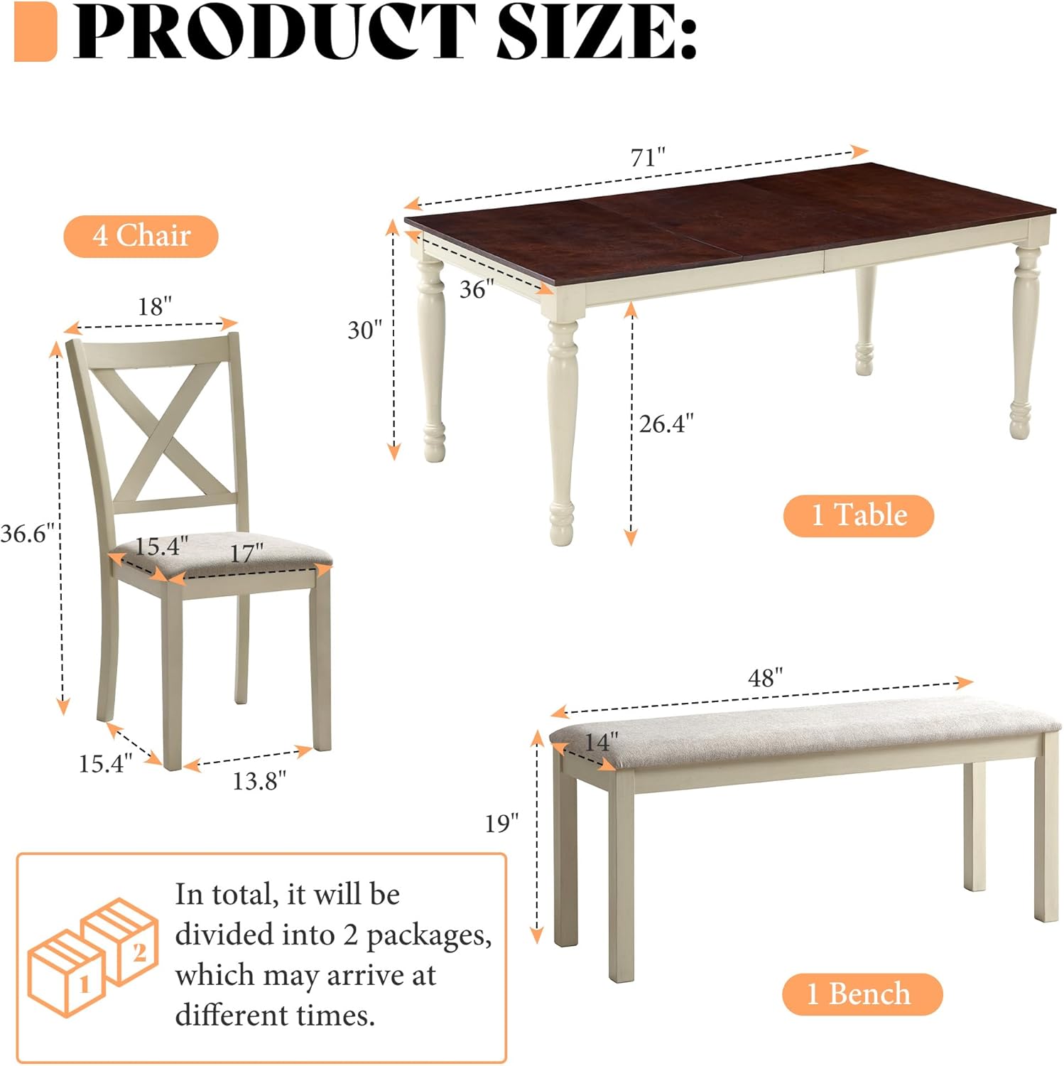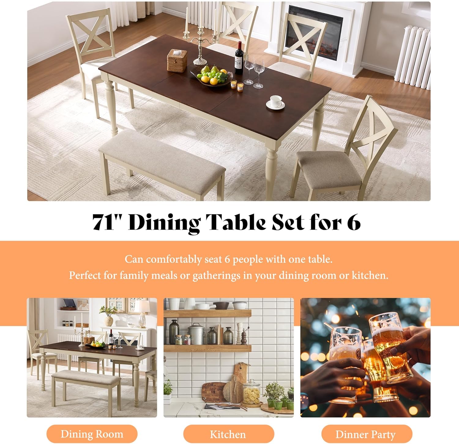 6-Piece Dining Table Set: 71″ large dining table and comes with 4 upholstered chairs and a stylish bench, comfortably seating 6-7. Perfect for family meals or gatherings in your dining room or kitchen