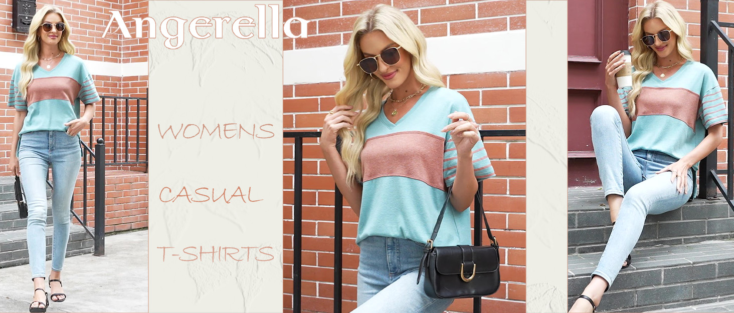 Angerella Womens Color Block Tops 2025 Summer Striped Short Sleeve T-Shirt Casual Crewneck Tunic Blouses Loose Fitted