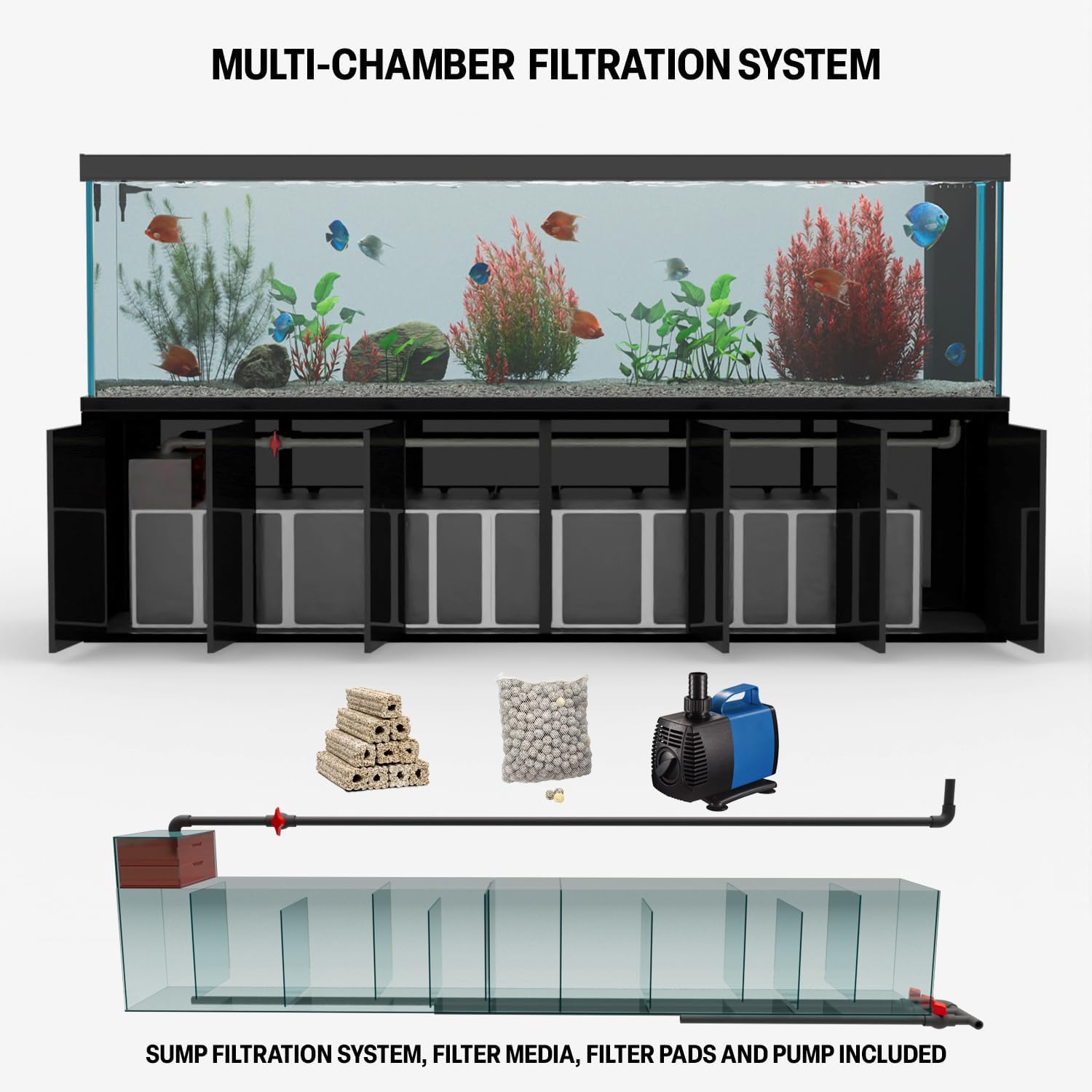 PROFESSIONAL SUMP FILTRATION: The massive 165-gallon sump includes a wet-dry system and modular media dividers. Powered by a high-flow 2000 GPH submersible pump, this sump filtration ensures optimal water quality essential for large-scale reef tank environments.