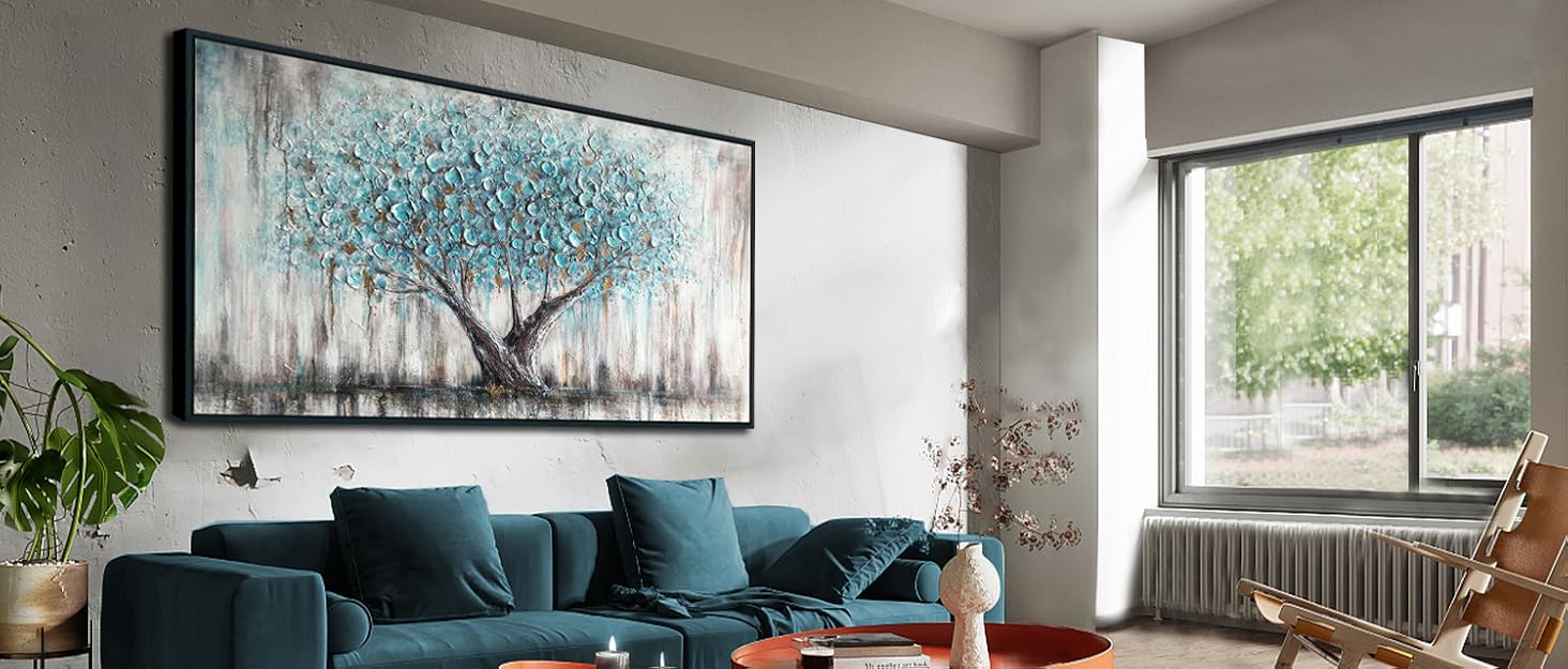 Blue tree wall art size: 40inx20in(100x50cm) gallery wrapped with hand painted textured. Canvas prints with 50% hand-paint to make it 3D. The vibrant colors and intricate details of this piece will bring a sense of tranquility and peace to any room