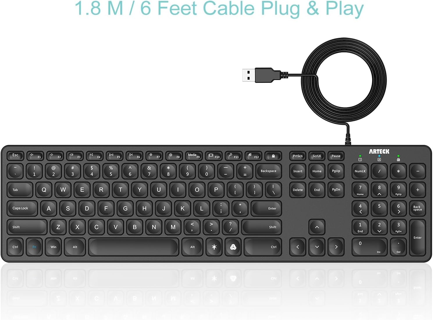Just simply insert the 1.8M (6 feet) USB wire into your computer like desktop or laptop, then the keyboard can be used instantly. No need driver. The cable length is 1.8 meters or 6 feet. It allows you to gain quick access to common functions, such as volume level, playback control, brightness, and more. It also provides arrow keys, number pad with slim and compact design.