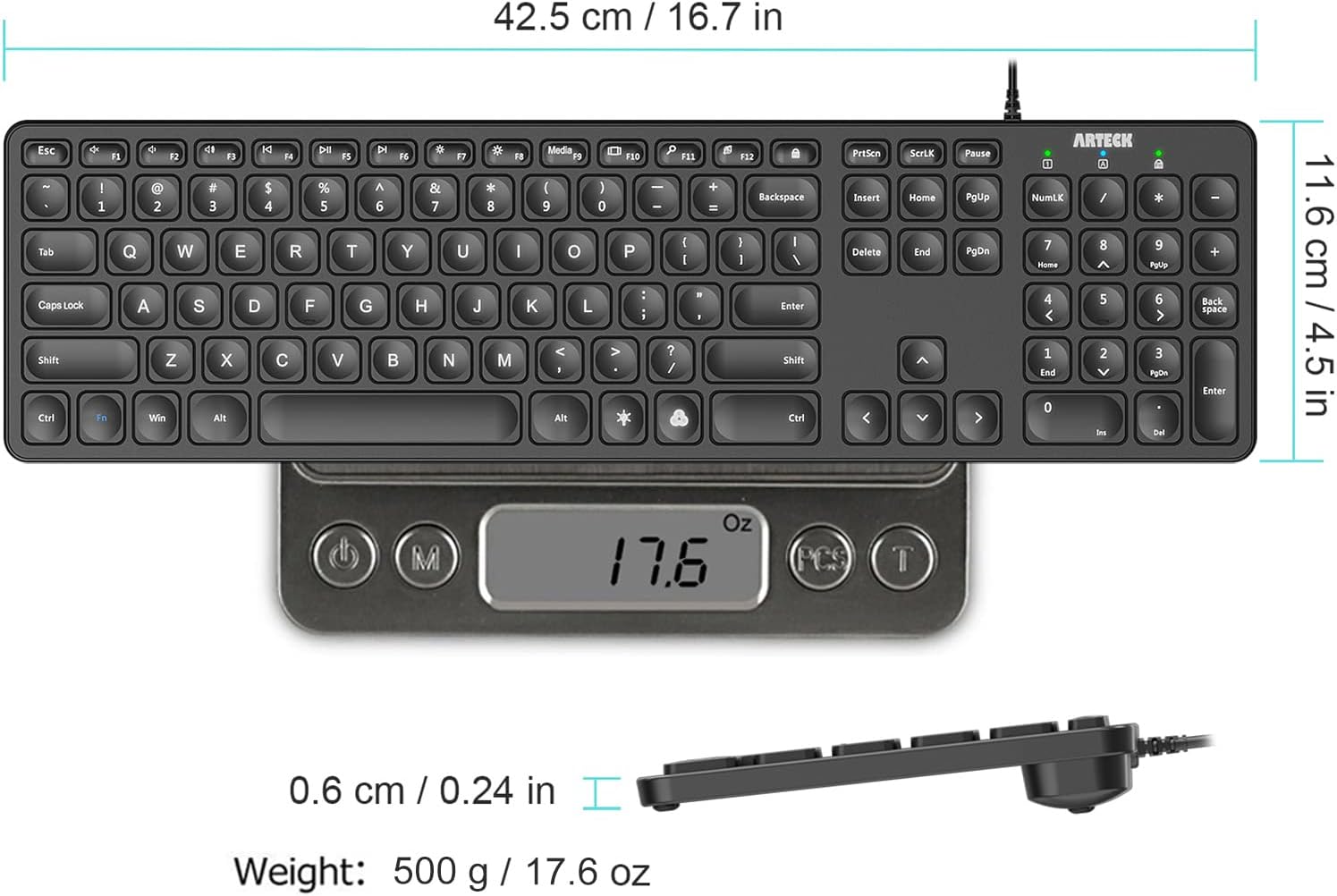 Ultra Thin and Light: Compact size (16.7 X 4.5 X 0.24in) and light weight (17.4oz) but provides full size keys, arrow keys, number pad, shortcuts for comfortable typing.