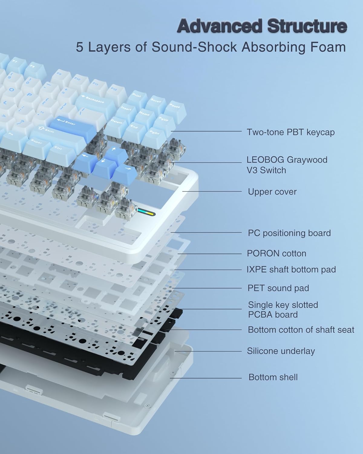 Gaming Keyboard with Advanced Structure: AULA F87 thocky keyboard features the most advanced construction and PCB single key slotting, with extended one-piece silicone pads to better optimize rebound and stability for a softer and more elastic feel. Five layers of sound deadening layers sandwiched between high quality acoustic cotton and air cushions effectively counteract the cavity sound of the shaft hitting the positioning plate, providing you with a quiet and soft-touch typing experience
