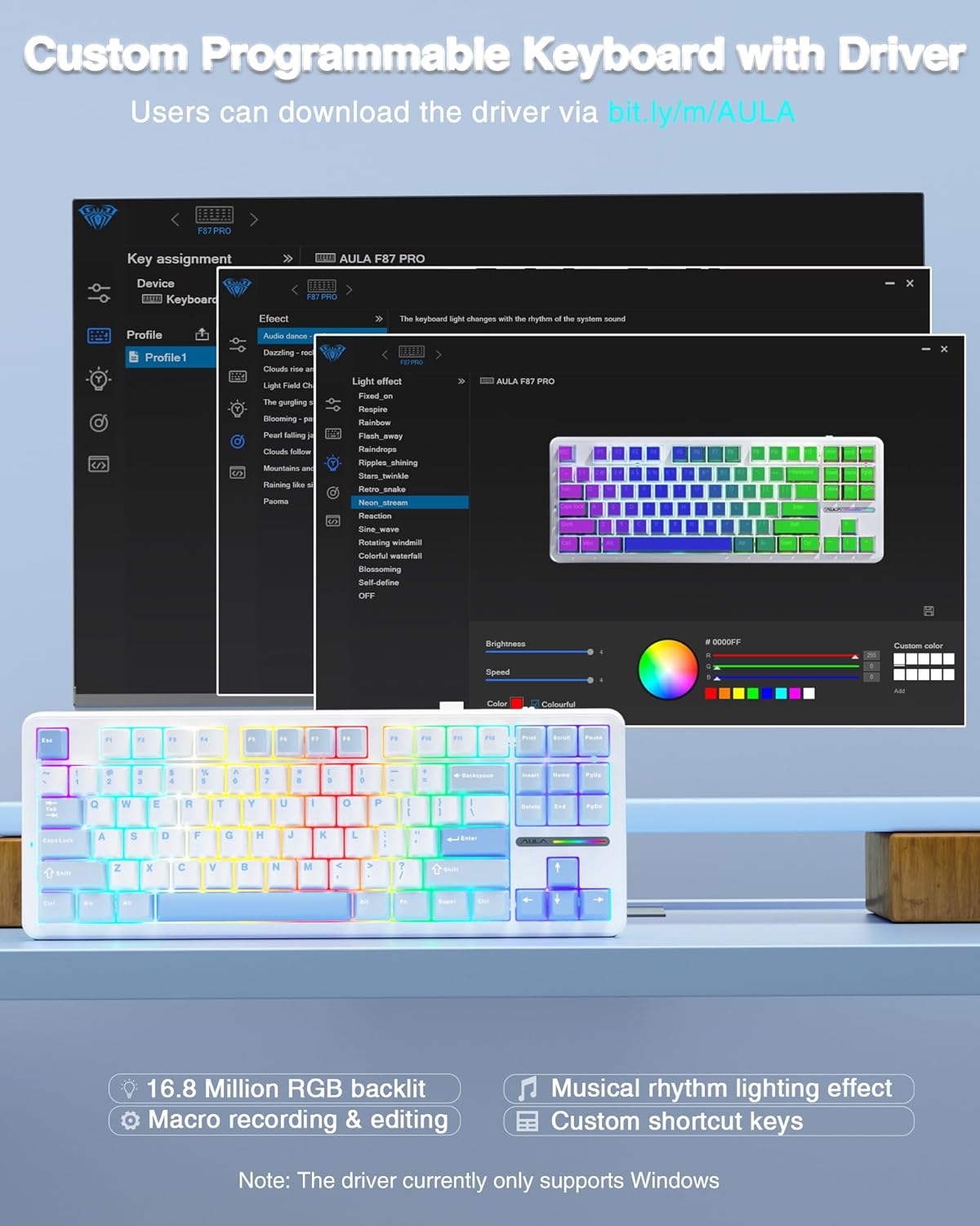 RGB Keyboard & Music Rhythm Lighting Effect: AULA F87 computer keyboard comes with 15 stunning rgb lighting effects, over 16.8 million rgb colors that can be customized through the driver, and rgb light bands on both sides of the backlit keyboard to add a stronger gaming atmosphere. What’s more, the wireless mechanical keyboard features 10 unique music rhythm lighting effects that change with the melodic beat of the music, pulling in a full sense of ambience