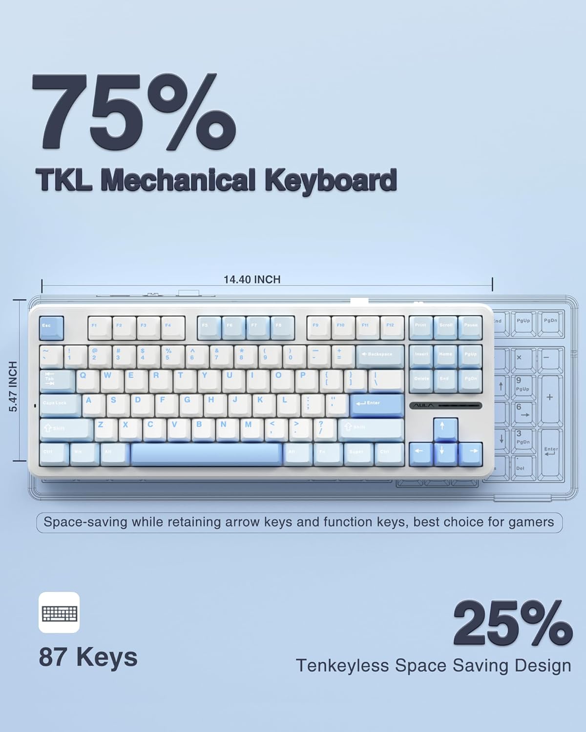 TKL Compact Keyboard & Excellent Quality: This 75% keyboard saves 25% desktop space while retaining the function keys and arrow keys for a more efficient office and smoother gaming experience. The PBT keycaps are super sweat and slip resistant for durability. F87 usb keyboard comes with a high capacity 4000mAh battery for a full day of daily use. With a lifespan of more than 60 million keystrokes, the wireless keyboard ensures stability and smoothness for years of use