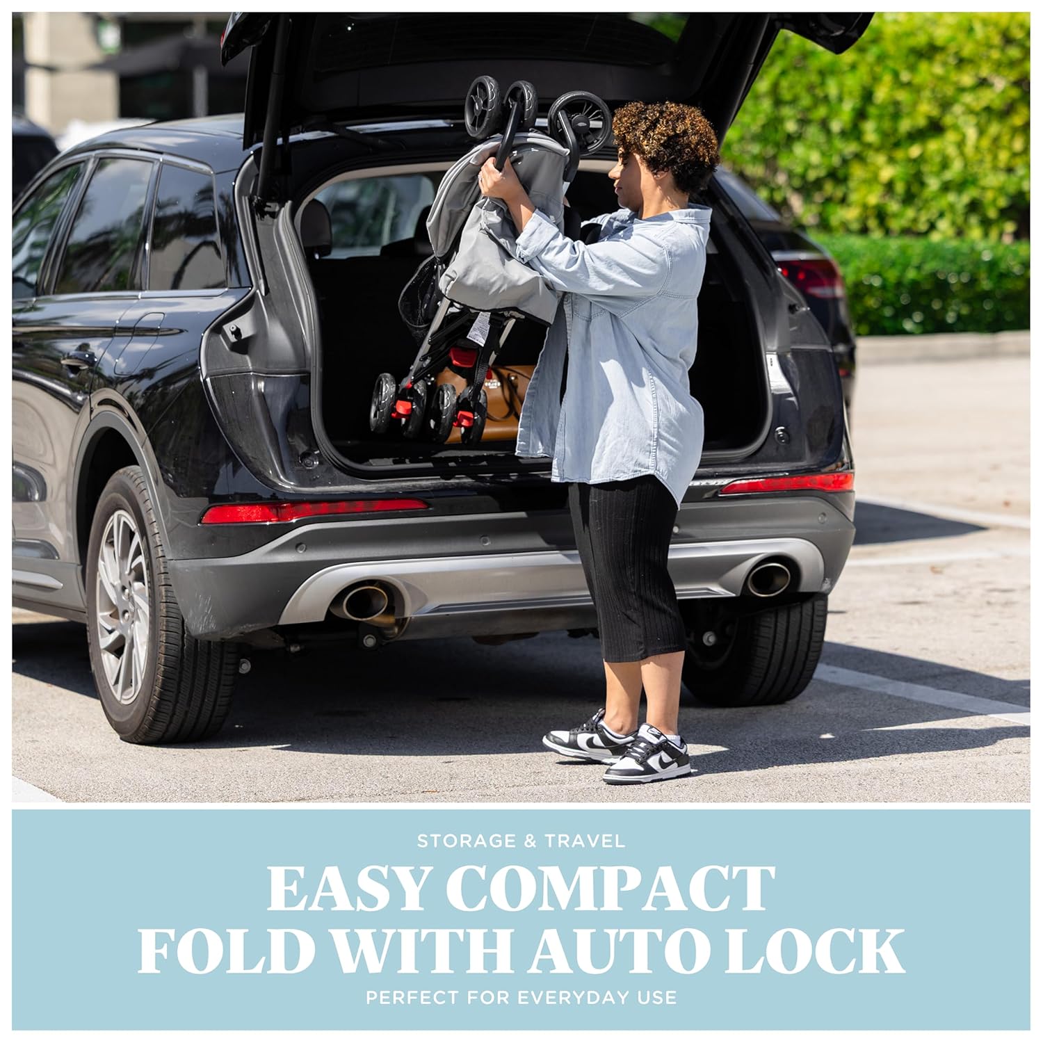 FOR TRAVEL AND EVERYDAY – Running errands, meeting for a playdate, or traveling? This lightweight, compact stroller has you covered! With a roomy reclining seat, adjustable harness, oversized canopy, cup holder, extra storage, quick fold, and smooth-rolling lockable wheels, it’s designed for comfort and convenience on the go.