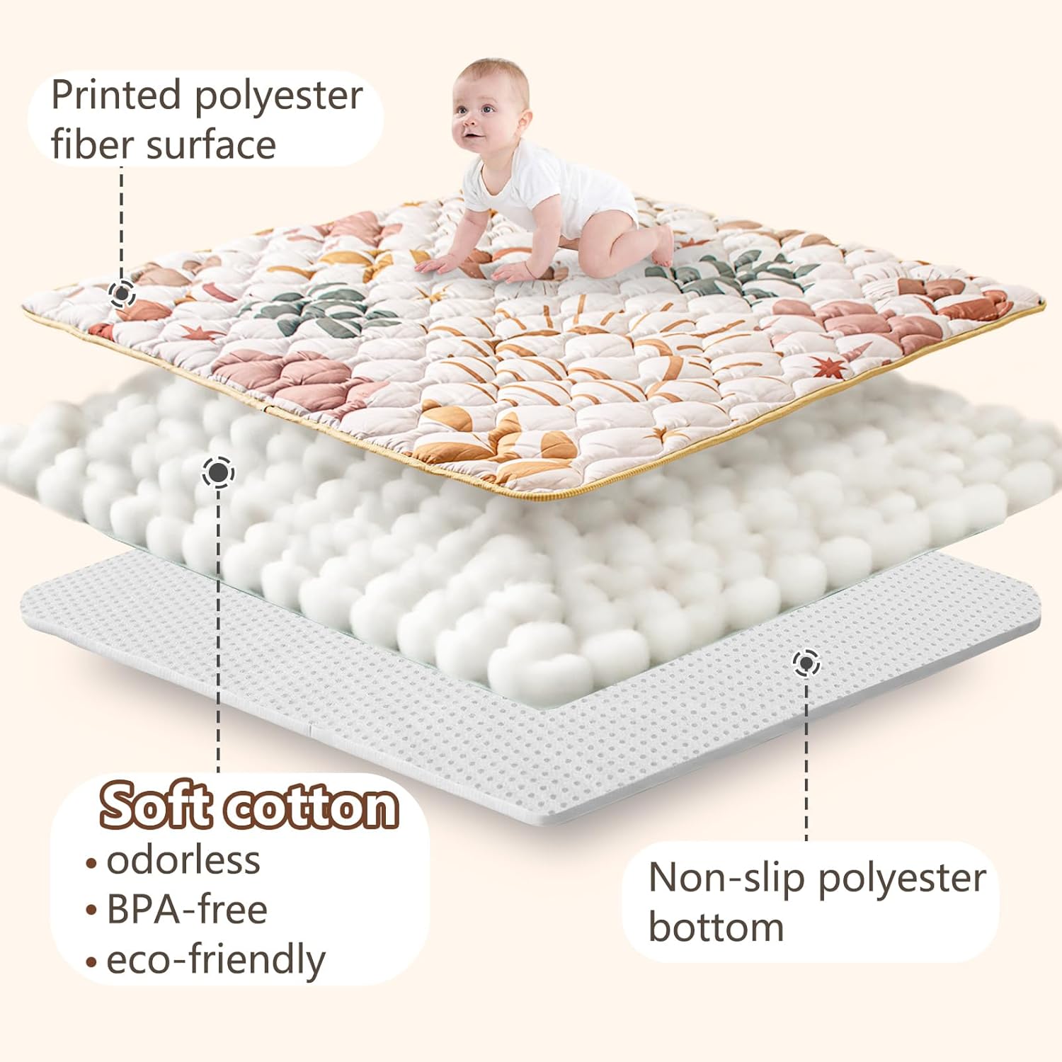 Great question! Our mat is made with fluffy, non-adhesive cotton filling instead of hard foam, so it feels more like a soft quilt than a sponge gym mat. This filling is odor-free, more breathable, and extra plush—making it especially suitable for babies to play, crawl, and nap on safely.