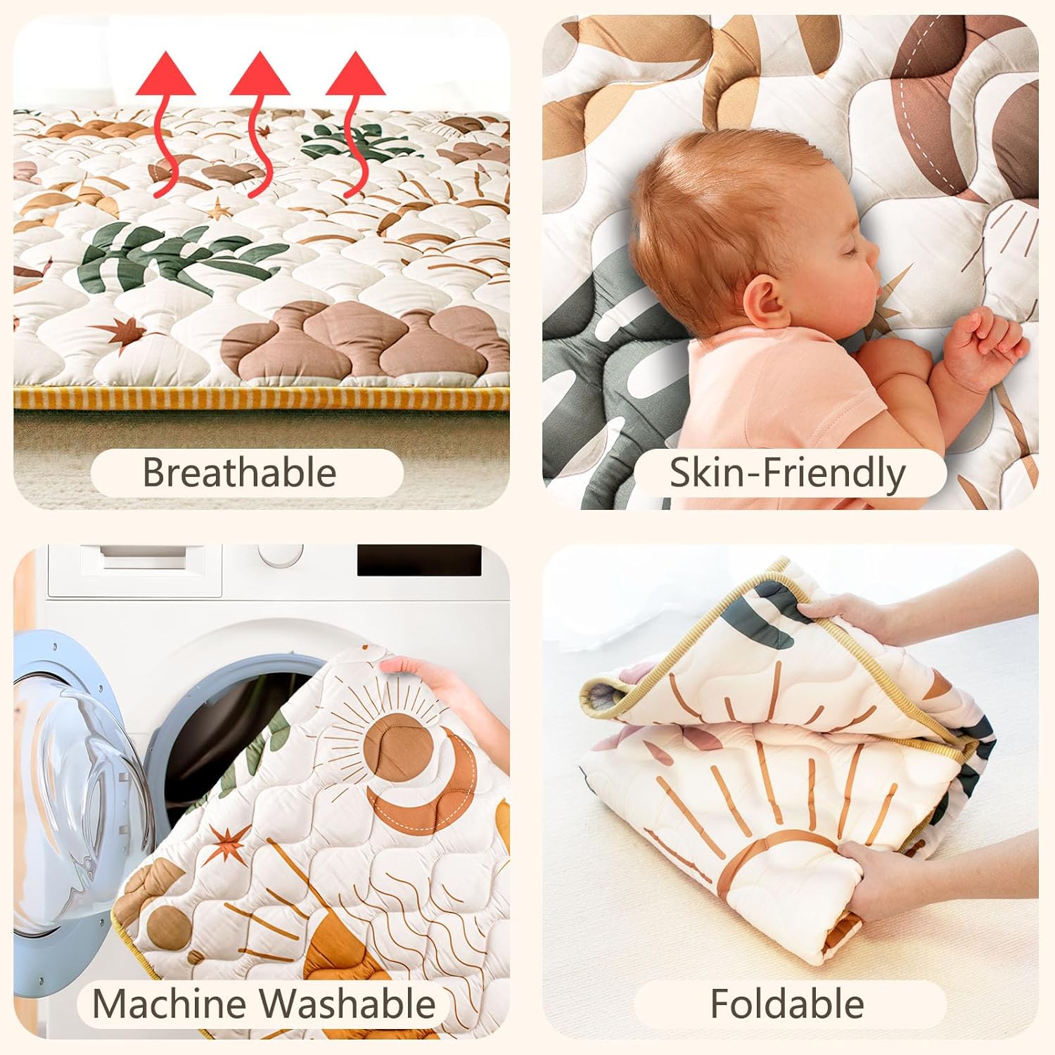 [Quick Recovery]: Our play mat is vacuum-packed to ensure cleanliness and safety during shipping, which may cause temporary creases or flattening. To help it regain its full shape quickly, simply use low-temperature ironing or gently machine wash and air dry