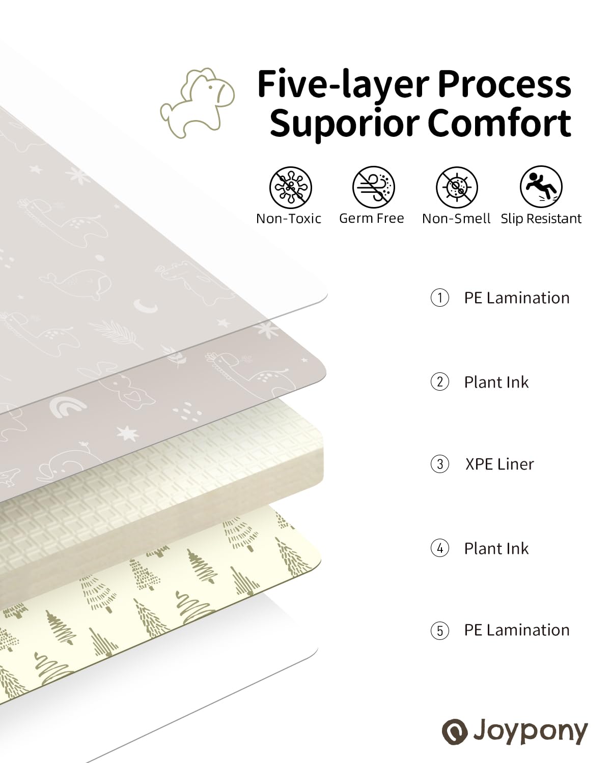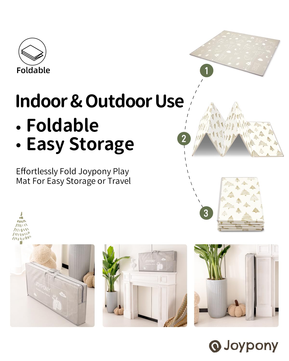 [SAFETY & COMFORT – FOREMOST PROMISE] – Made from high-density XPE foam material, our baby play mat is BPA-free, child-friendly, and no chemical smell, ensuring a soft and safe play surface for infants and toddlers. Its cushioned design is perfect for protecting little ones from hard floors and providing extra support during tummy time. Joypony play mat is truly reliable, safe and and is ready to use right out of the box.