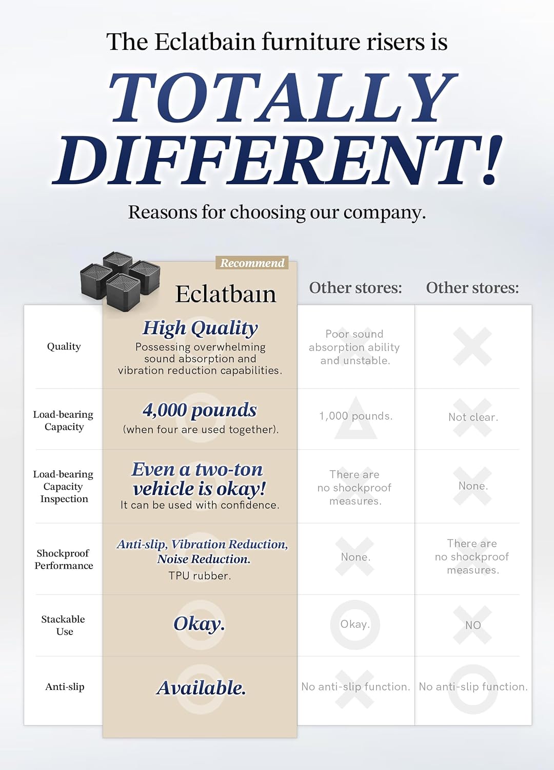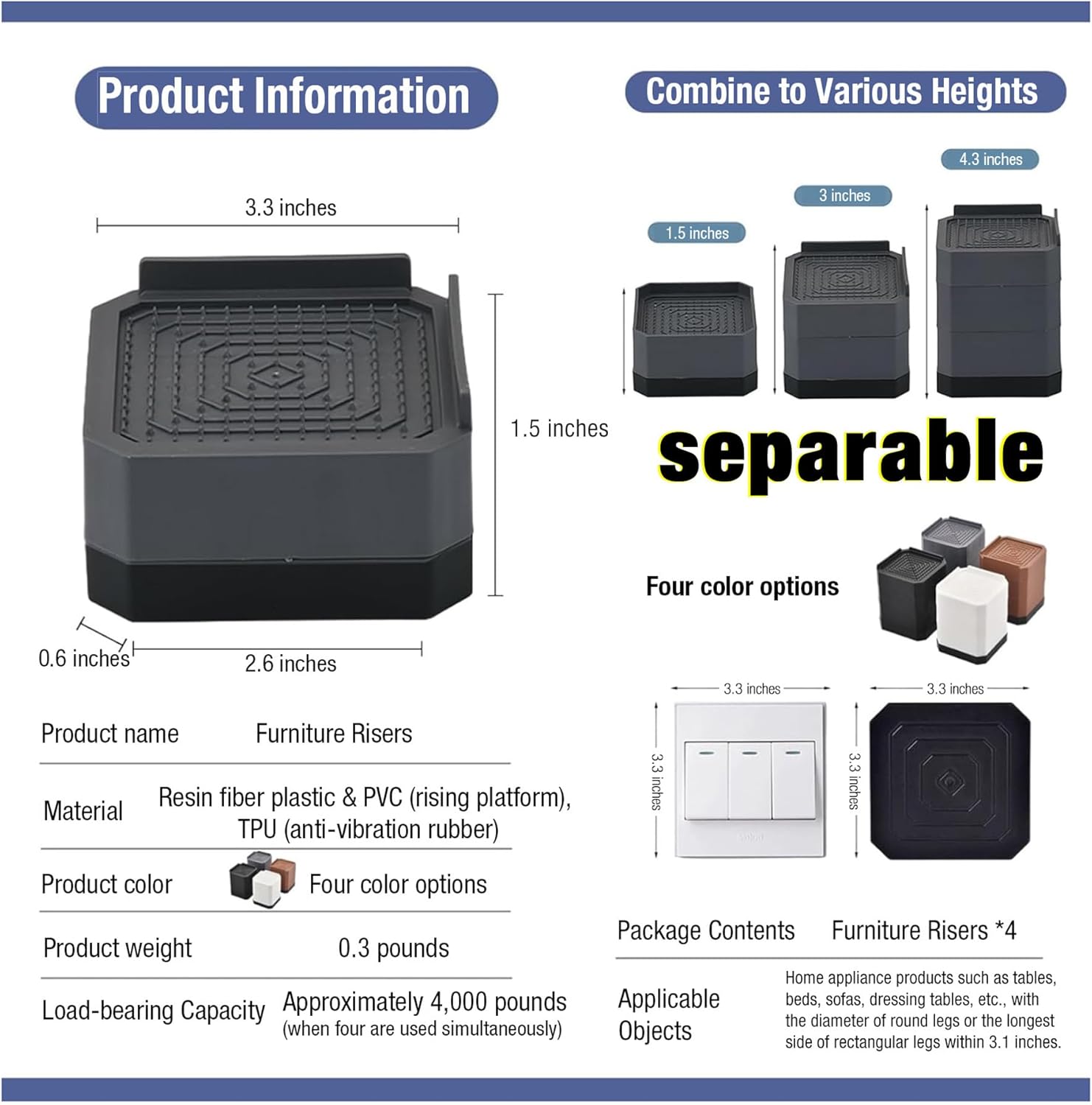 【Durable Materials】The furniture risers are made of highly durable polypropylene material. When four risers are used simultaneously, they can support a weight of 4,000 pounds. The impressive weight capacity protects your furniture.