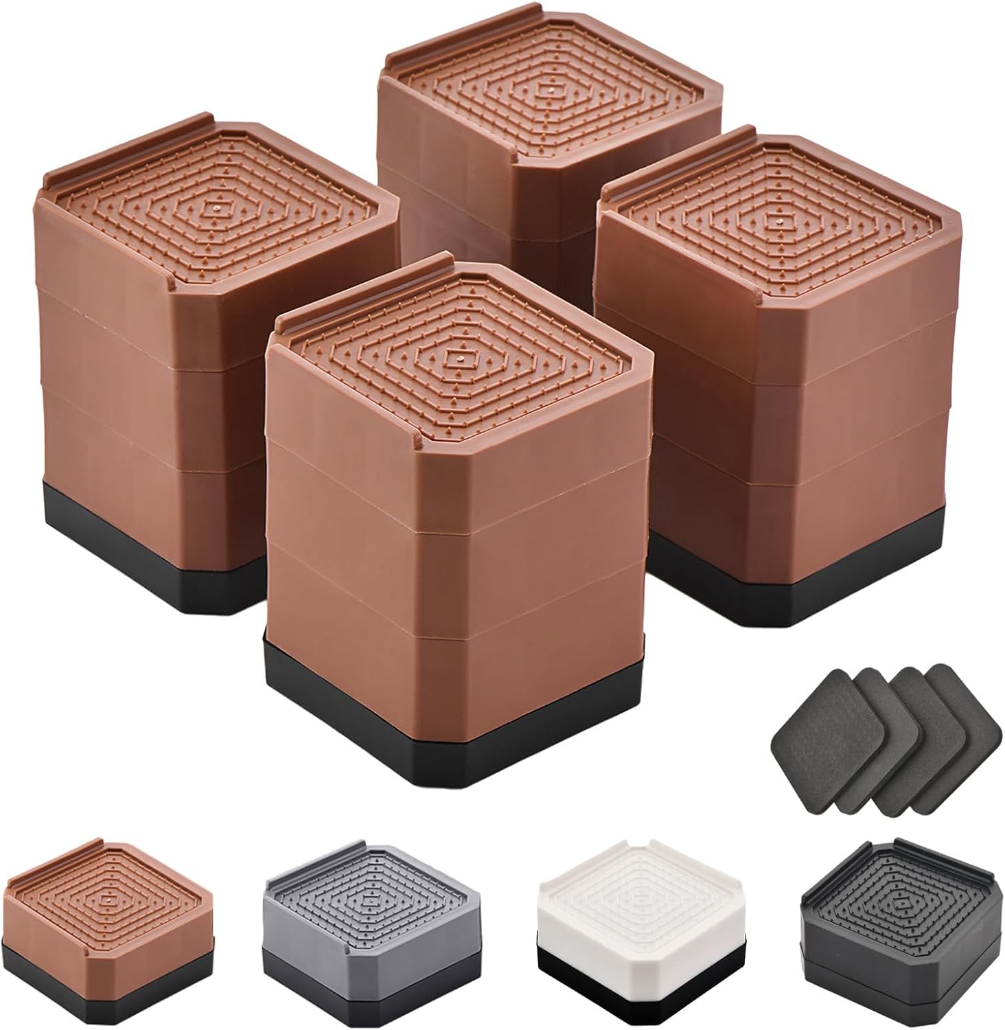 【Slip-prevention and Shock Absorption】The surface of the bed furniture risers is rough and uneven, effectively preventing the overall instability caused by the furniture legs slipping. What’s more, the bottom of these bed leg risers is made of TPU slip-prevention rubber, which can adhere tightly and firmly to the floor. While protecting the floor, it won’t leave any dents or scratches.