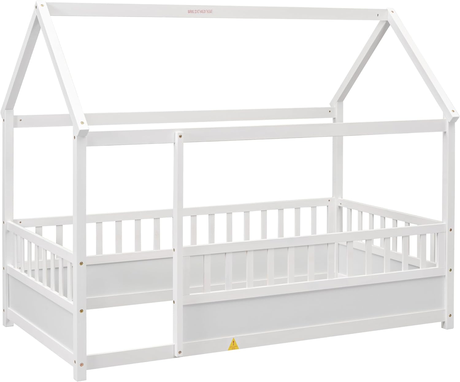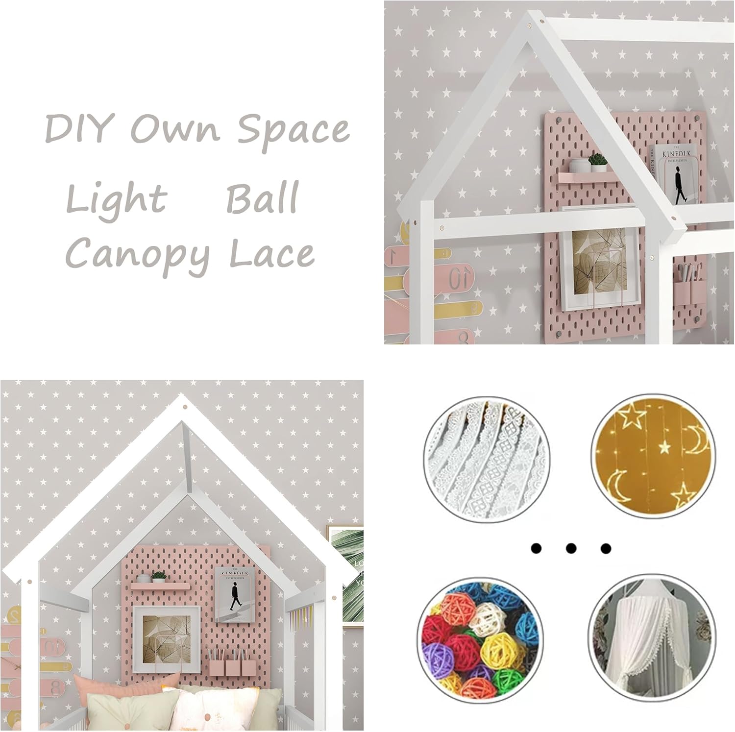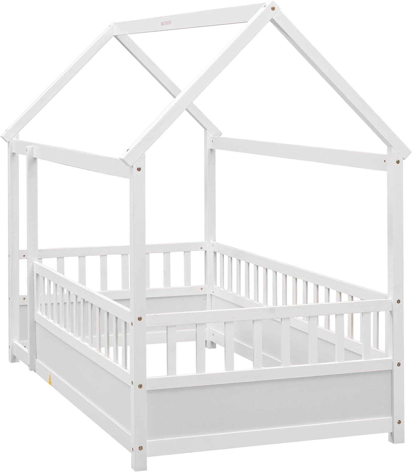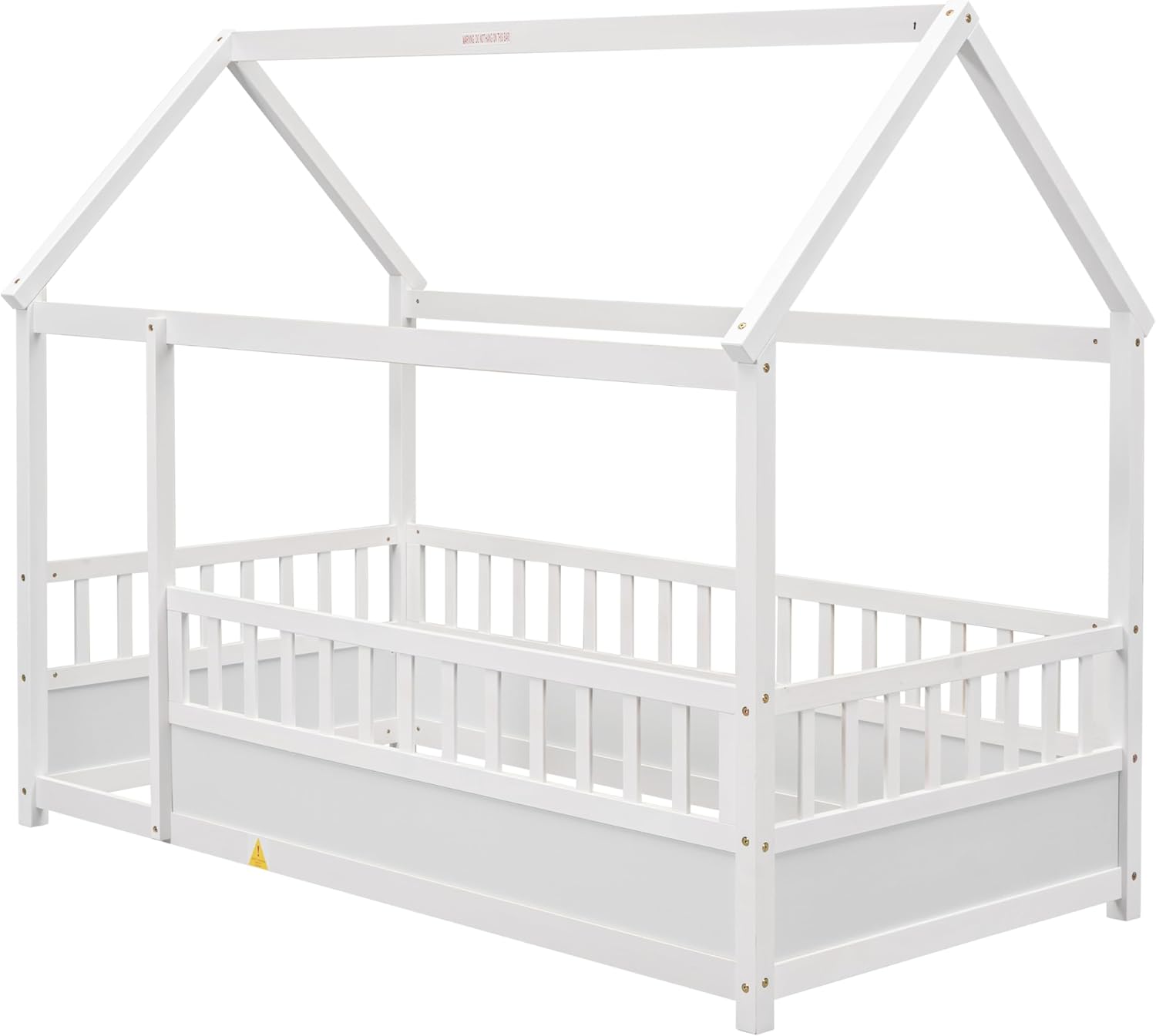 🏆🏆 【House Bed for Kids: DIY Own Sapce】Featuring house-shaped roof, fence and door, this twin size house bed creates a more fun & adorable sleeping space. Kids can DIY their own montessori floor bed to be more fantastic meanwhile increase interaction with your kids. You can freely DIY on the roof with valances, lamps and so on to create a dreamy sleeping space.