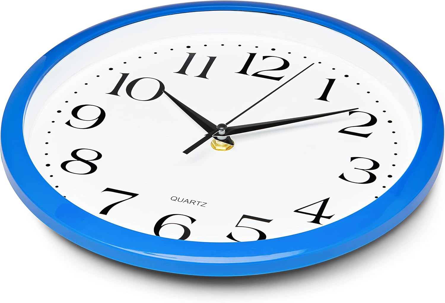 10 inch blue Quartz Analog wall clock. Large black bold numbers are easy to read from any angle. Precise quartz movements guarantee accurate time