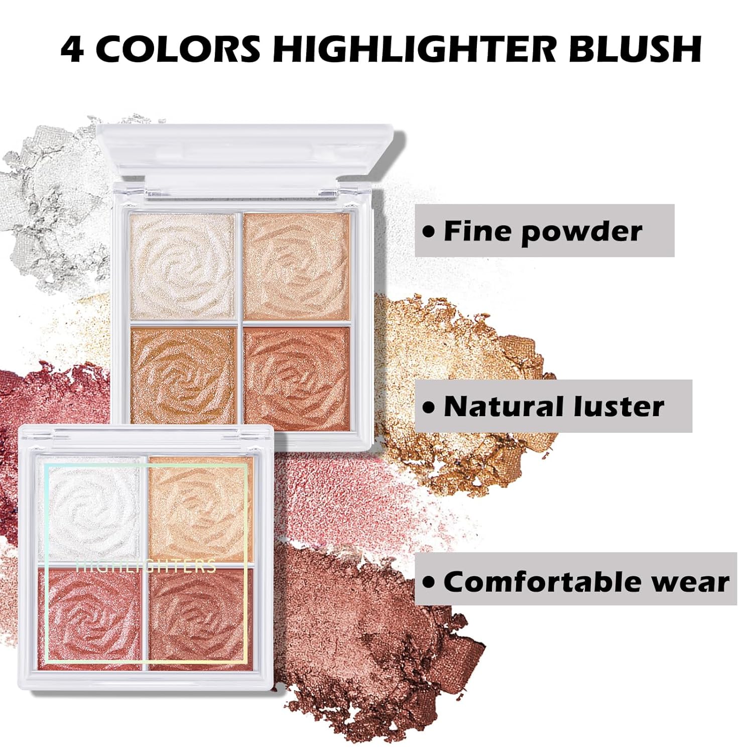 Boobeen Blush and Highlighter Palette- 4-color Metallic Shimmer Shadow Powder, Illuminator Makeup Set for Shading, Highlighting & Defining the Face
