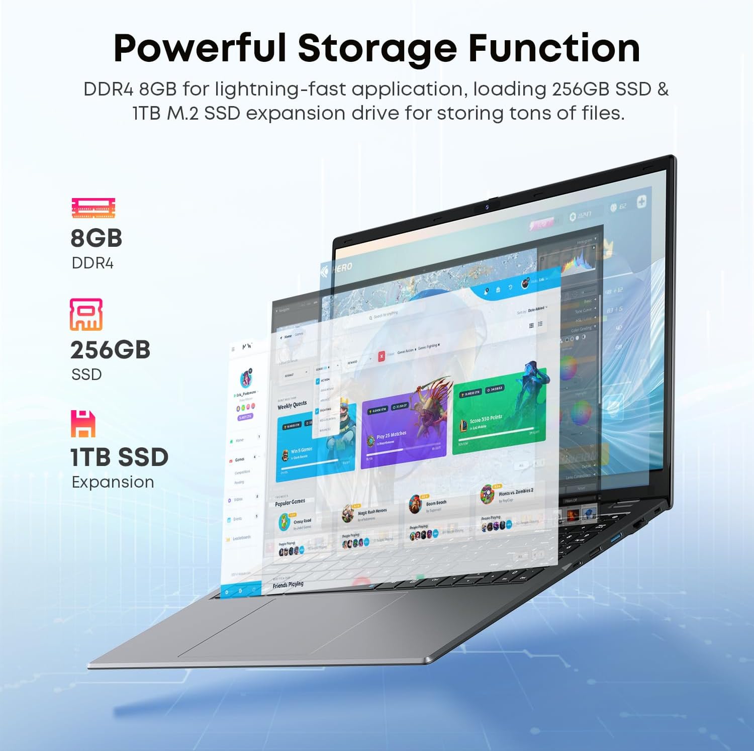 【No Latency Connection】Herobook Plus laptop pc builts in 2.4G/5G dual-band WIFI, providing high-speed transmission and download. Bluetooth 4.2 for easy and stable connection of additional devices within range. Its full-size ergonomic keyboard and large trackpad also enhance your typing and navigation experience.