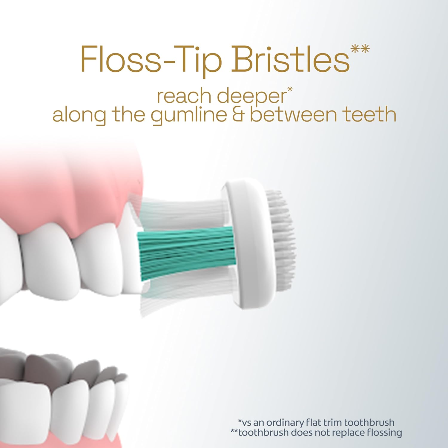 This manual toothbrush features medium tapered Floss-Tip (1) bristles that reach deeper (2) along the gumline and between teeth to remove bacteria