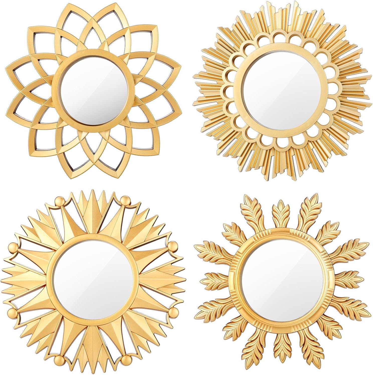 Gold Plastic Flower Mirrors: The gold flower mirrors for wall decor come in a pack of 4, which are about 9.84 x 9.84 x 0.79 inches with the PVC frame, the diameter of the glass is about 3.94 inches, allowing you to use the small round mirror to decorate several rooms, these decorative round mirrors are plastic frame and painted gold, ideal wall decor for living room, bedroom, hallway, lounge and office