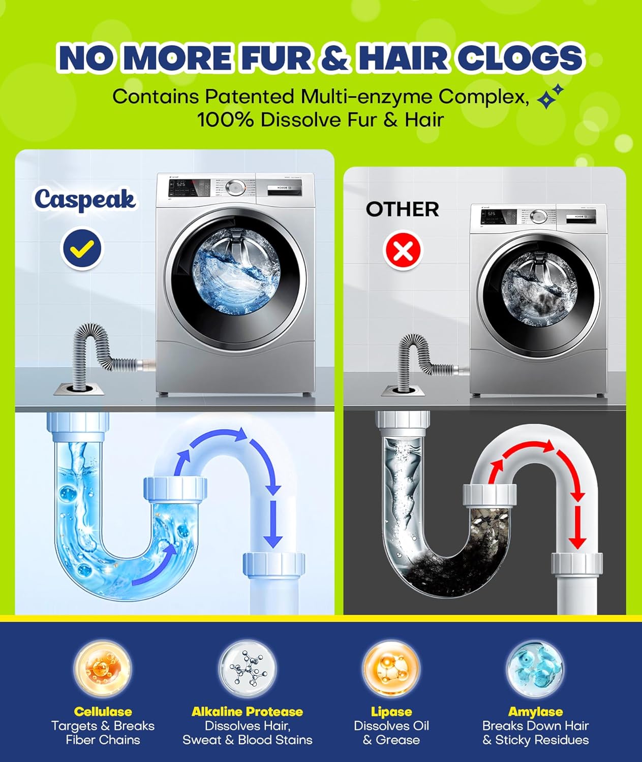 PESKY FUR? LET OUR ENZYME FORMULA HANDLE IT – Caspeak pet hair dissolver for washing machine contains patented multi-enzyme complex. It targets fiber chains in pet and human hair, breaking them down and 100% dissolving them. Specially made for pet families, Caspeak laundry cleaner dissolves quickly and leaves no chemical residues behind — safe for both pets and humans. Say goodbye to pet fur clinging to your clothes after every wash!