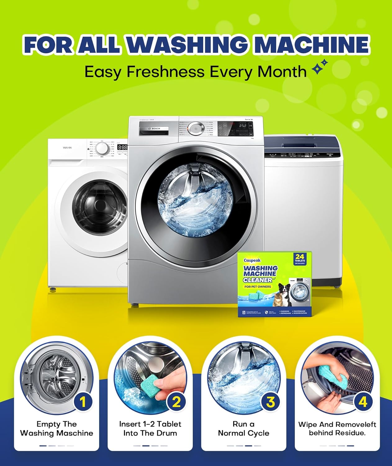 WE DON’T HIDE ODORS, WE WIPE THEM OUT- Caspeak washer machine cleaner tablets use a powerful “ODOR-LOCK” technology, capture and destroy odors at the molecular level — and eliminate them down the drain for good! With a fresh, light scent and minimal fragrance, our washer cleaner tablets leave your washer truly fresh — no lingering awful smells like others. Feel the powerful odor removal in just 1 use!