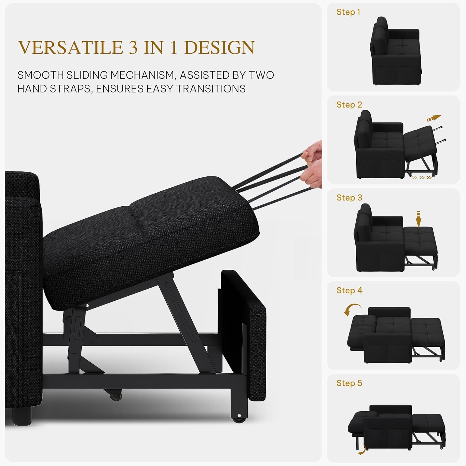 3-in-1 Convertible sofa bed: Introduce our ultra-comfortable sleeper couch. Whether it’s for daily lounging in your living room or hosting guests in your guest room, this futon couch brings a cozy retreat for anyone seeking restful moments.