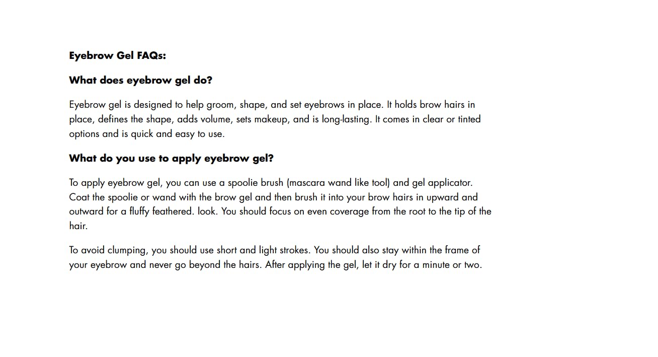 ULTIMATE EYEBROW GEL: The best eyebrow gel for achieving the fluffy on trend “soap brows.” This extreme-hold brow gel instantly lifts, sculpts & grooms every brow hair into place with a clear, natural finish that looks good on all skin tones & brow colors