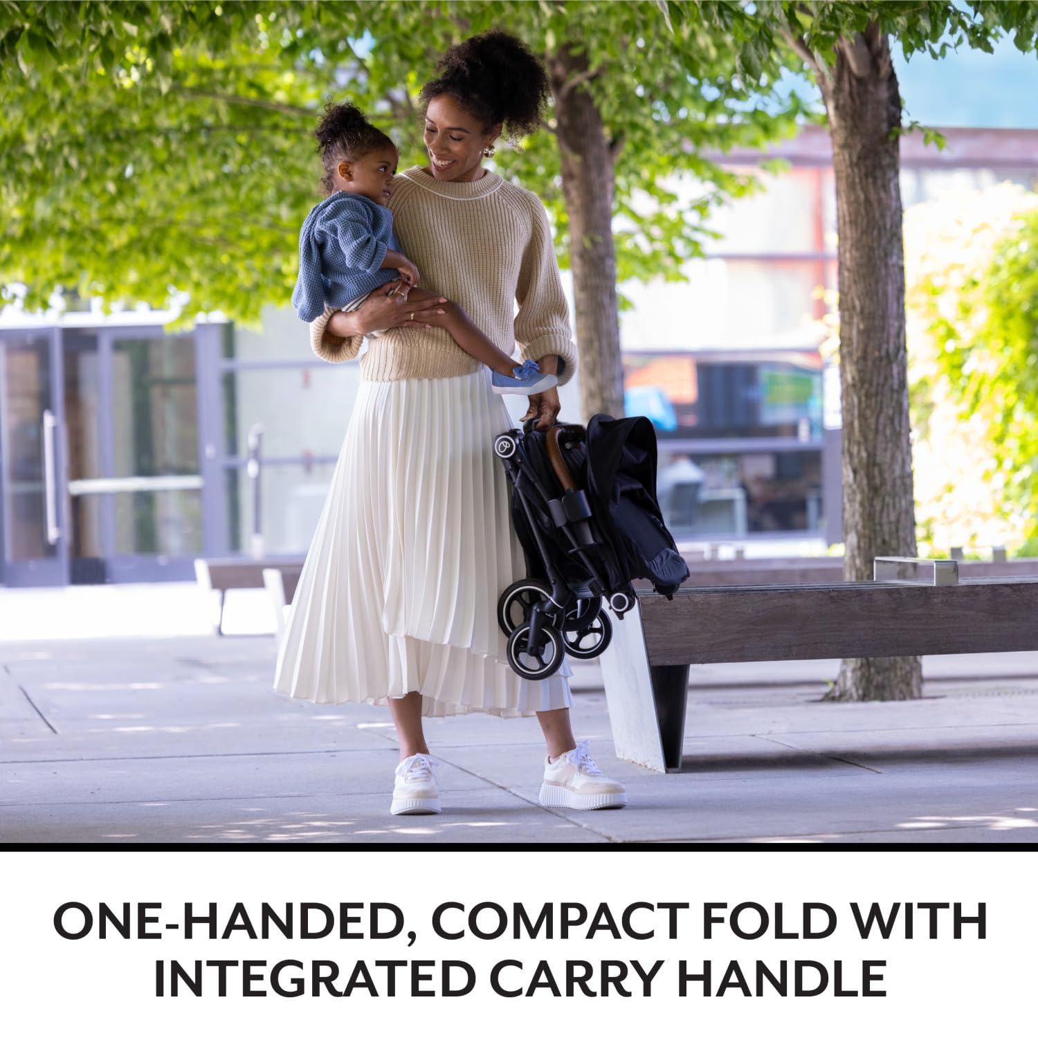 FOLD WITH ONE HAND: A one-handed compact fold and an integrated carry handle make the Hummingbird Stroller easy and portable for everyday errands and travel