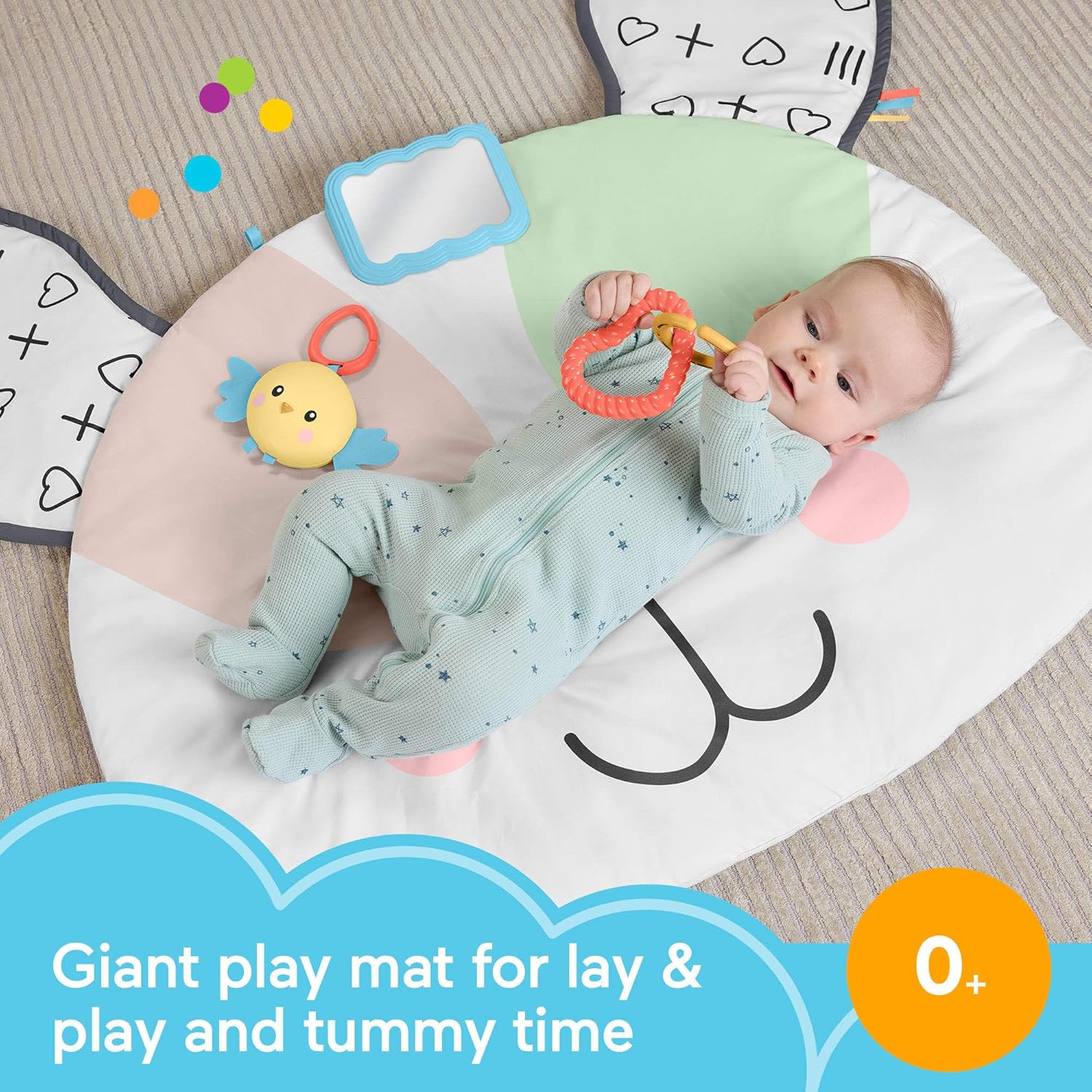 Tummy time is tail-wagging fun for your baby with the Puppy Perfection Giant Play Mat from Fisher-Price. This extra-large baby activity mat offers lots of space and exciting sensory details for newborns to explore as they grow from lay & play to tummy time and beyond. Designed with a friendly puppy face, high-contrast colors and a crinkle ear, this playmat comes with a prop-up self-discovery mirror and 2 linkable toys for little ones to rattle and teethe. Colors and decorations may vary.