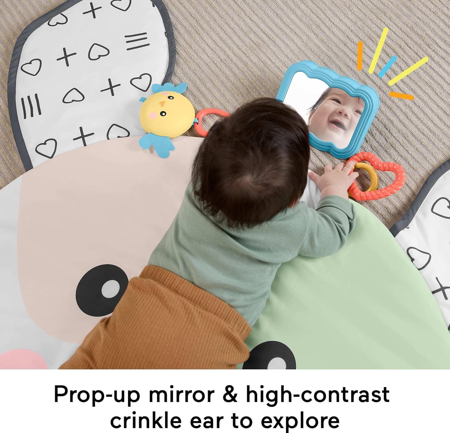 Playmat features a prop-up self-discovery mirror, high-contrast colors and a crinkle ear for engaging sensory play