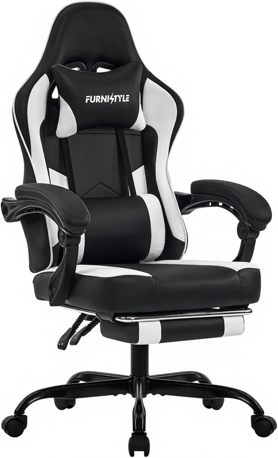 Gaming Chair for Adults and Teens, Ergonomic Leather Video Game Chairs with Footrest, Wide Seat, Reclining Back, Neck & Lumbar Support, Adjustable Swivel Computer Desk Chair, Black/White