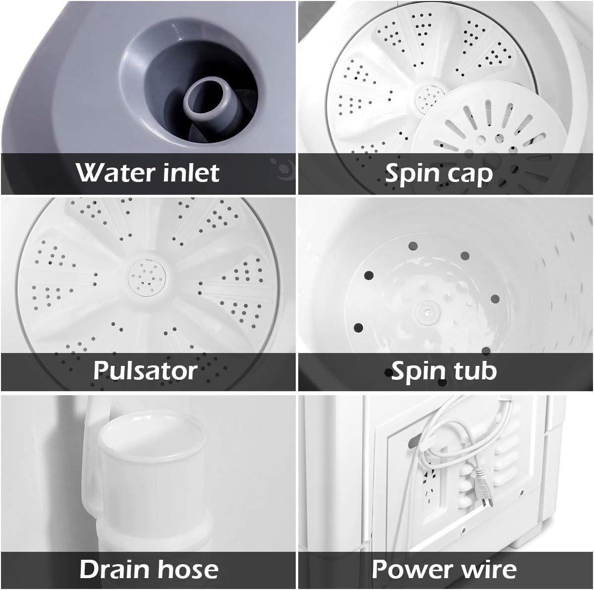 Color: Gray and WhiteMaterial: ABS+ PPNet Weight: 29.3 LbsWashing Power:260WSpinner Power: 140WLength of inlet pipe: 44.5″Length of drain pipe: 20.5″Package Include:1× washing machine