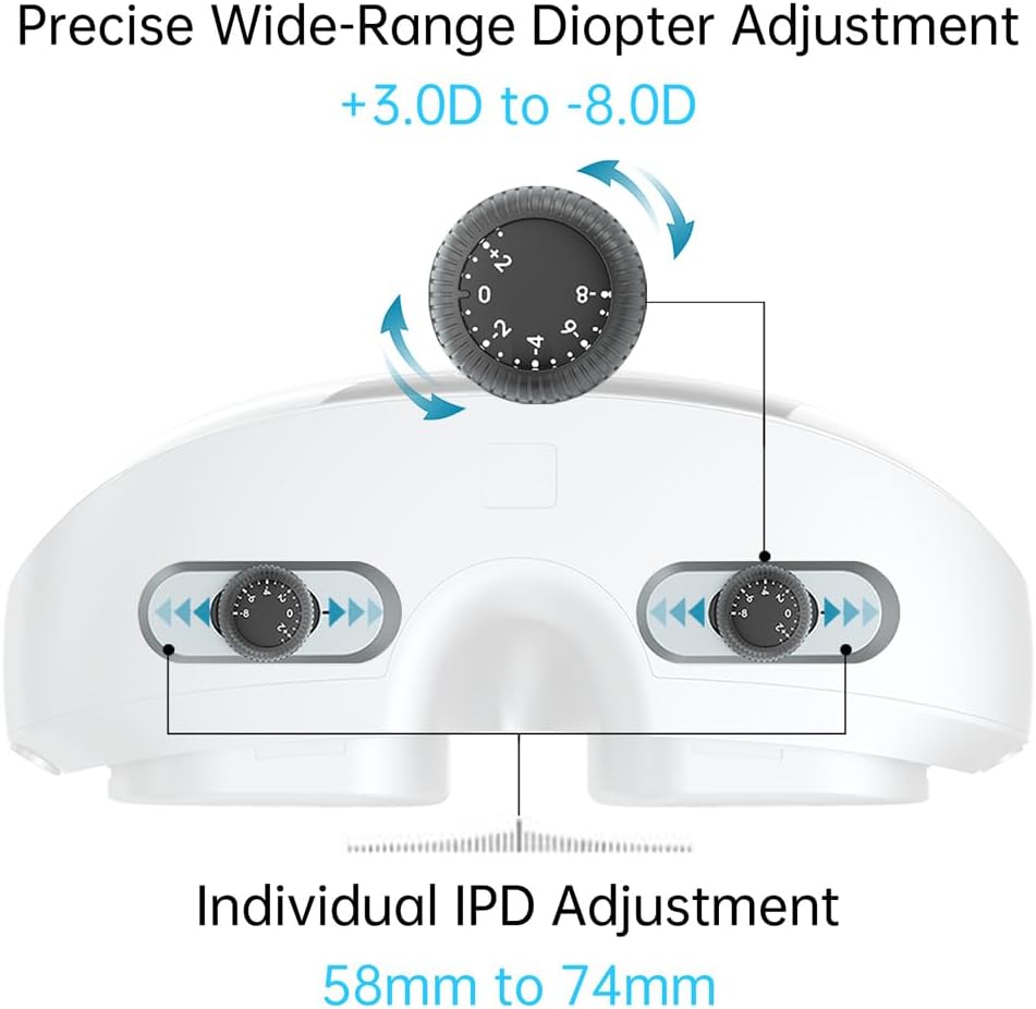 【+2.0D to -8.0D Diopter Adjustment, No Glasses Needed】Enables smooth, individual adjustment for each eye. Spanning +2.0D to -8.0D, it accommodates a wide range of prescriptions and ensures sharp, comfortable viewing without the need for glasses.