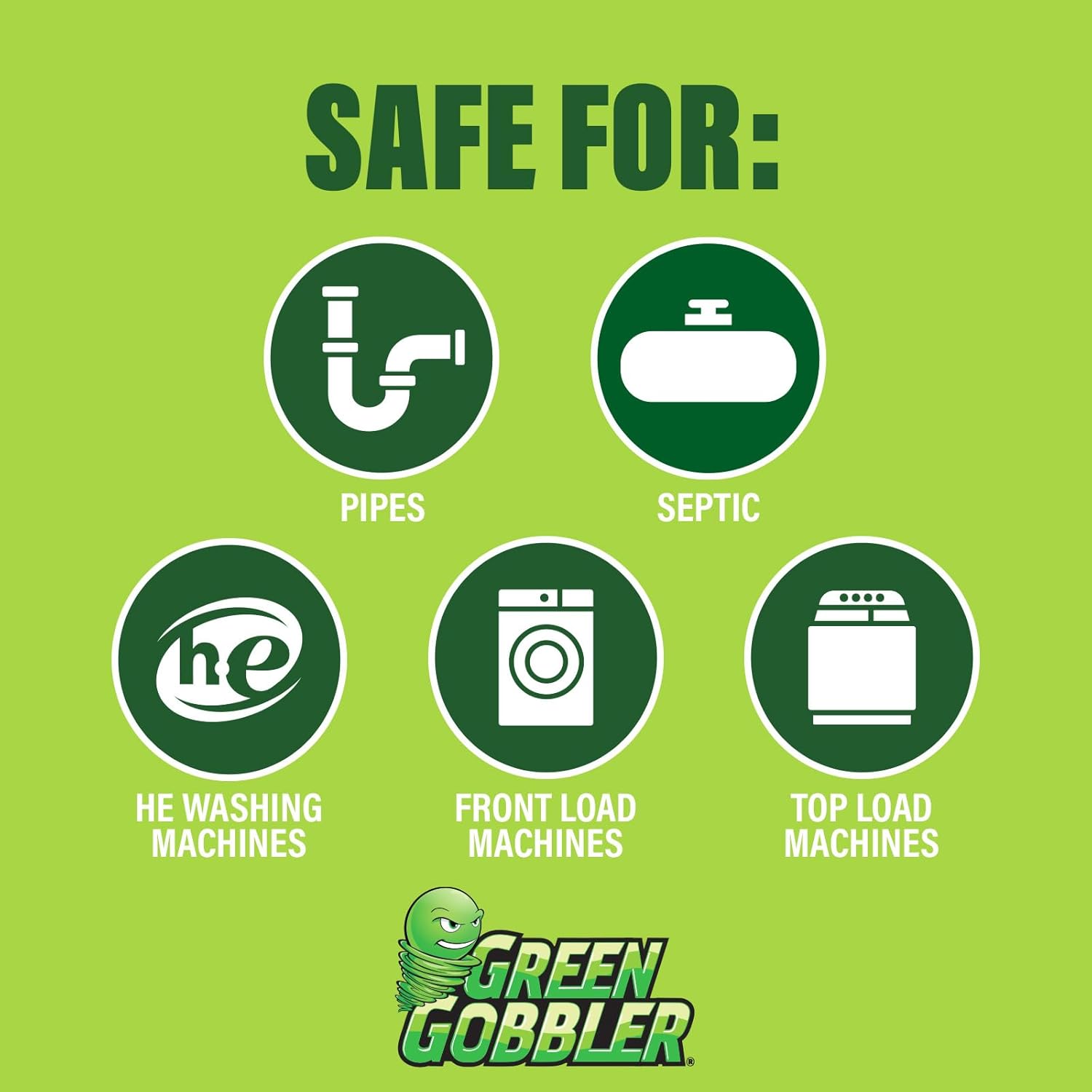 SAFE FOR WASHING MACHINES: Won’t damage delicate washing machine seals and gaskets. Ideal for any top load, front load & high efficiency washing machines, Green Gobbler is also safe for your pipes & septic.