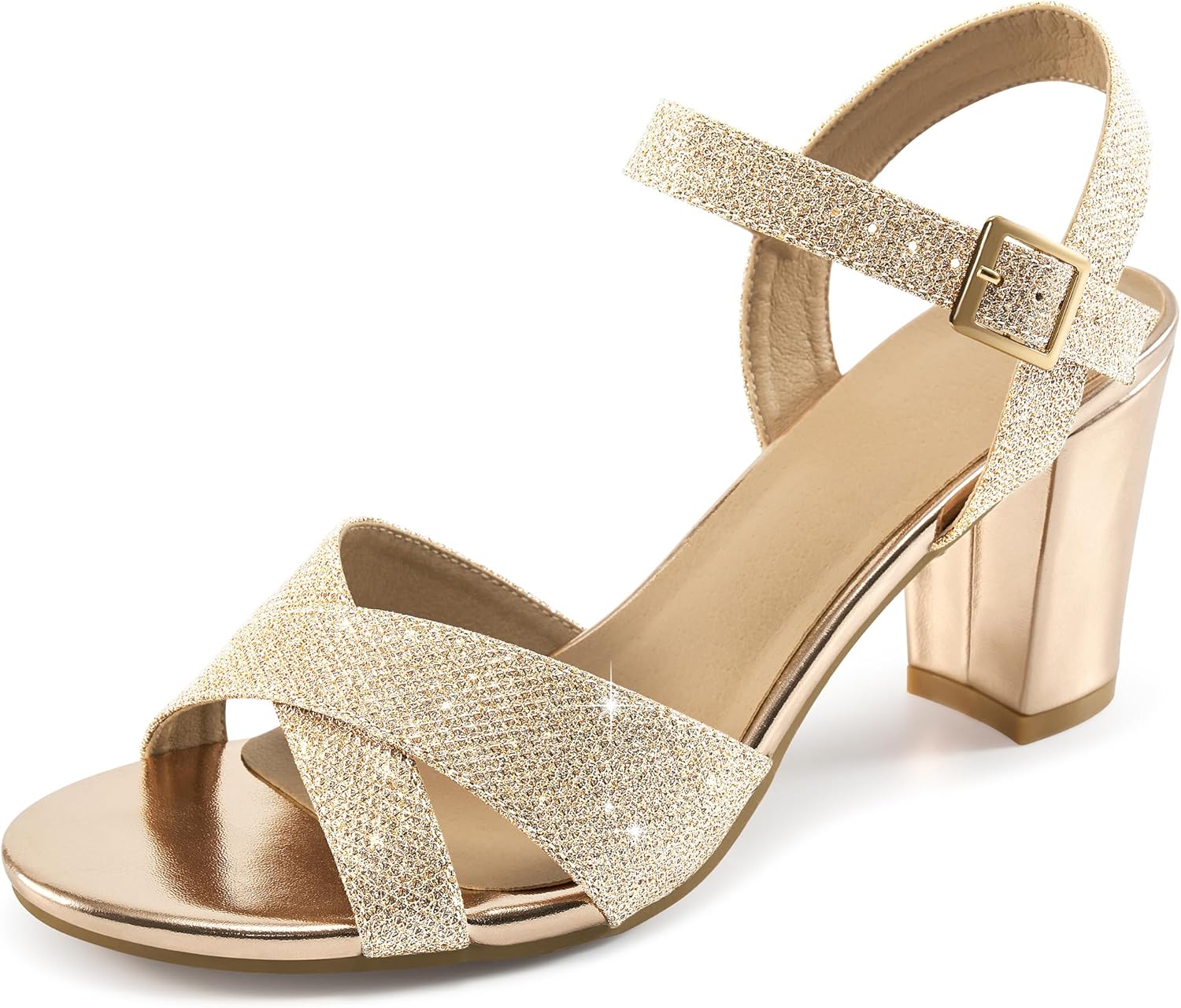 HARENCE Chunky Heels for Women Wedding: Fashion Sparkly Dressy Shoes Open Toe Ankle Strap Heeled Sandal for Prom Party