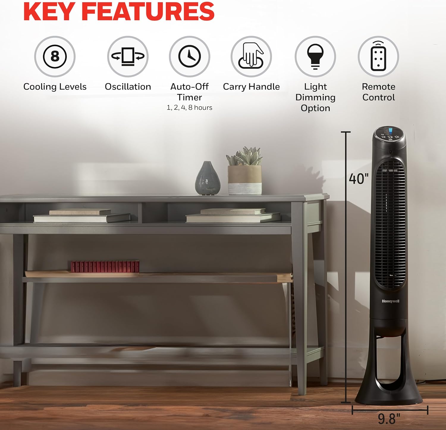 The Honeywell QuietSet tower fan is powerful, quiet and whole-room cooling. It offers eight levels of quiet control, from “sleep” to “power cool.” It features oscillation and remote control. A 8-hour auto shut-off timer and 5 light dimming options add convenience. Reach-through carrying handle makes it easy to move. This tall oscillating fan with remote for personal cooling is designed with your comfort in mind. Backed with a 1-year limited warranty.