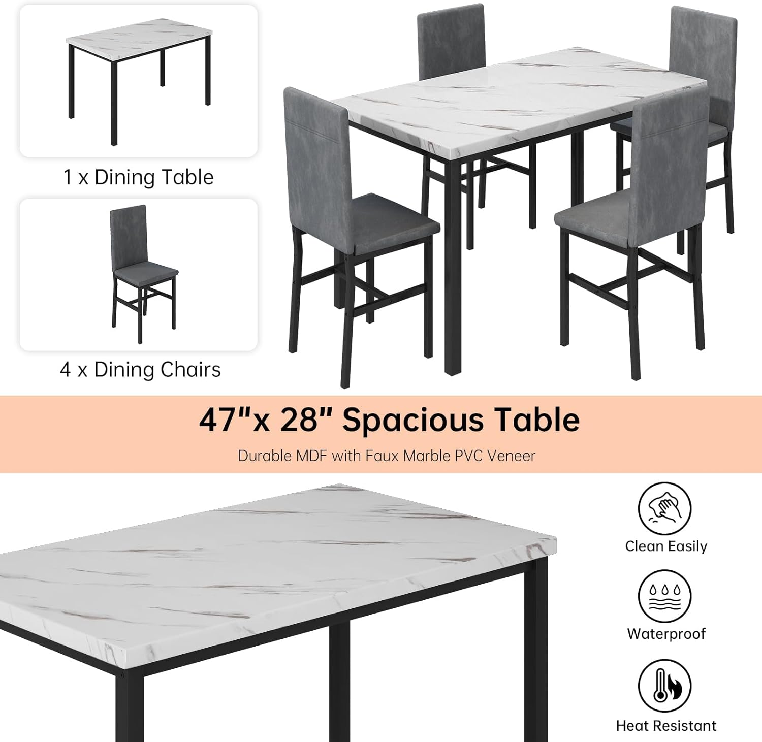 【Sturdy & Stable Construction】This five-piece dining table and chair set features a heavy-duty steel frame and reinforced MDF imitation marble tabletop to ensure superior stability and long-lasting durability. Ideal for everyday dining and gatherings