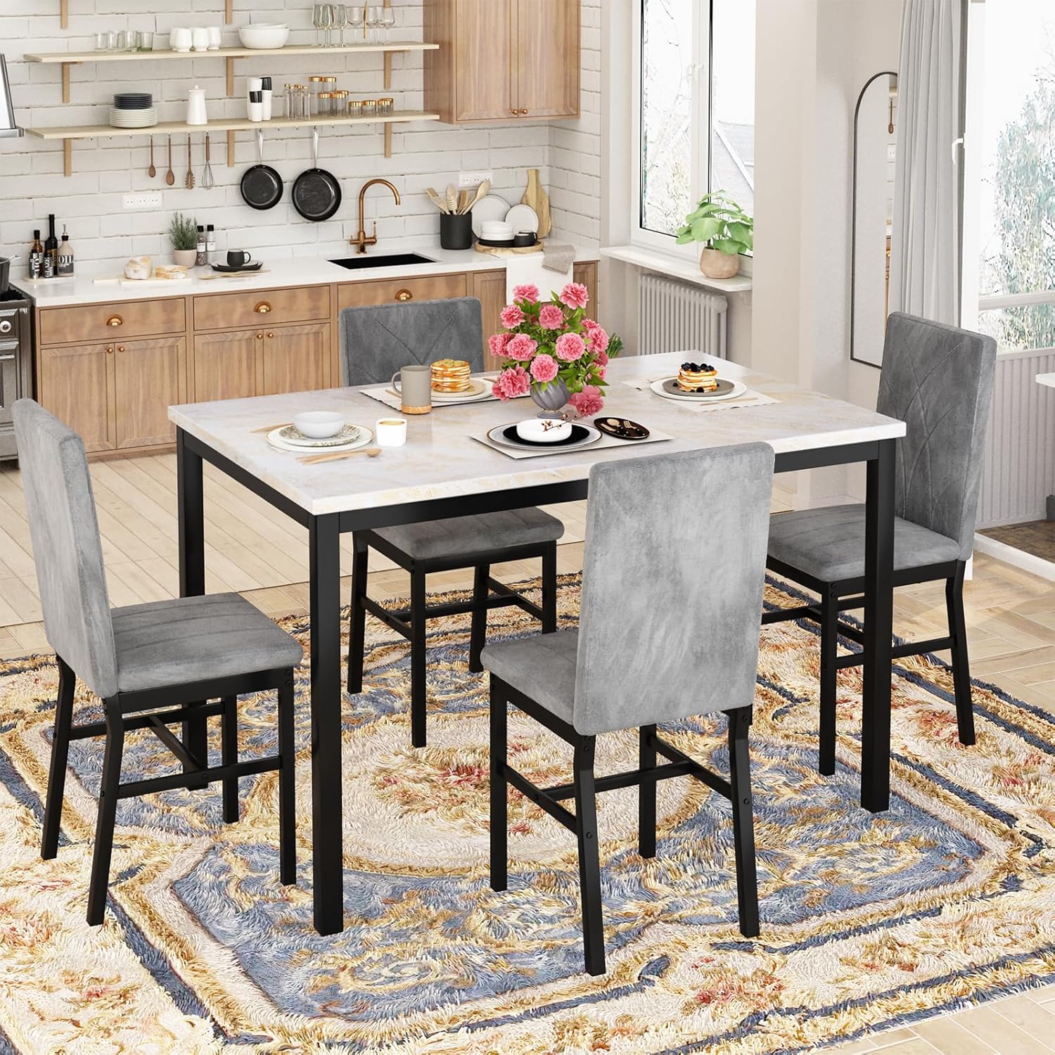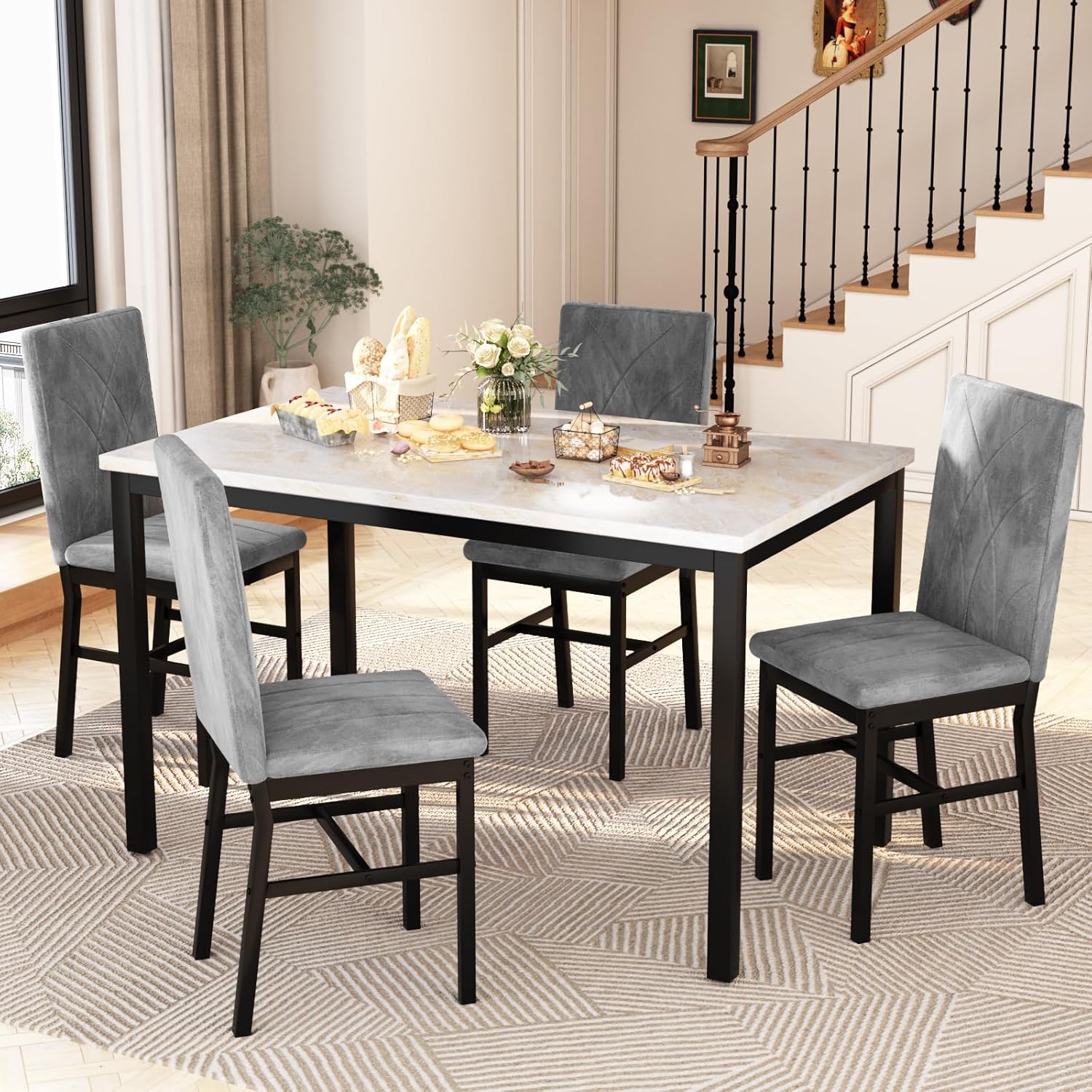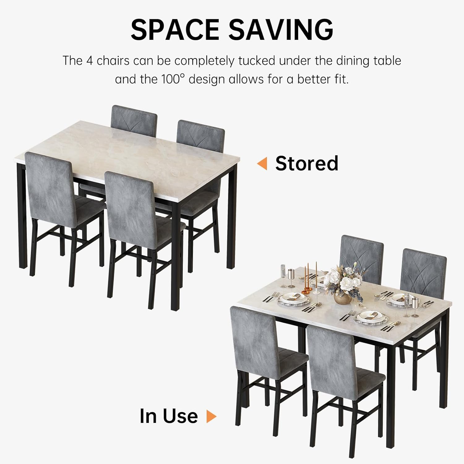 Durable and Sturdy Dining Room Set: This 5-piece faux marble dining table and chairs set is made of solid MDF board with strong load-bearing capacity. The metal frame is coated for durability and has non-slip feet for added stability