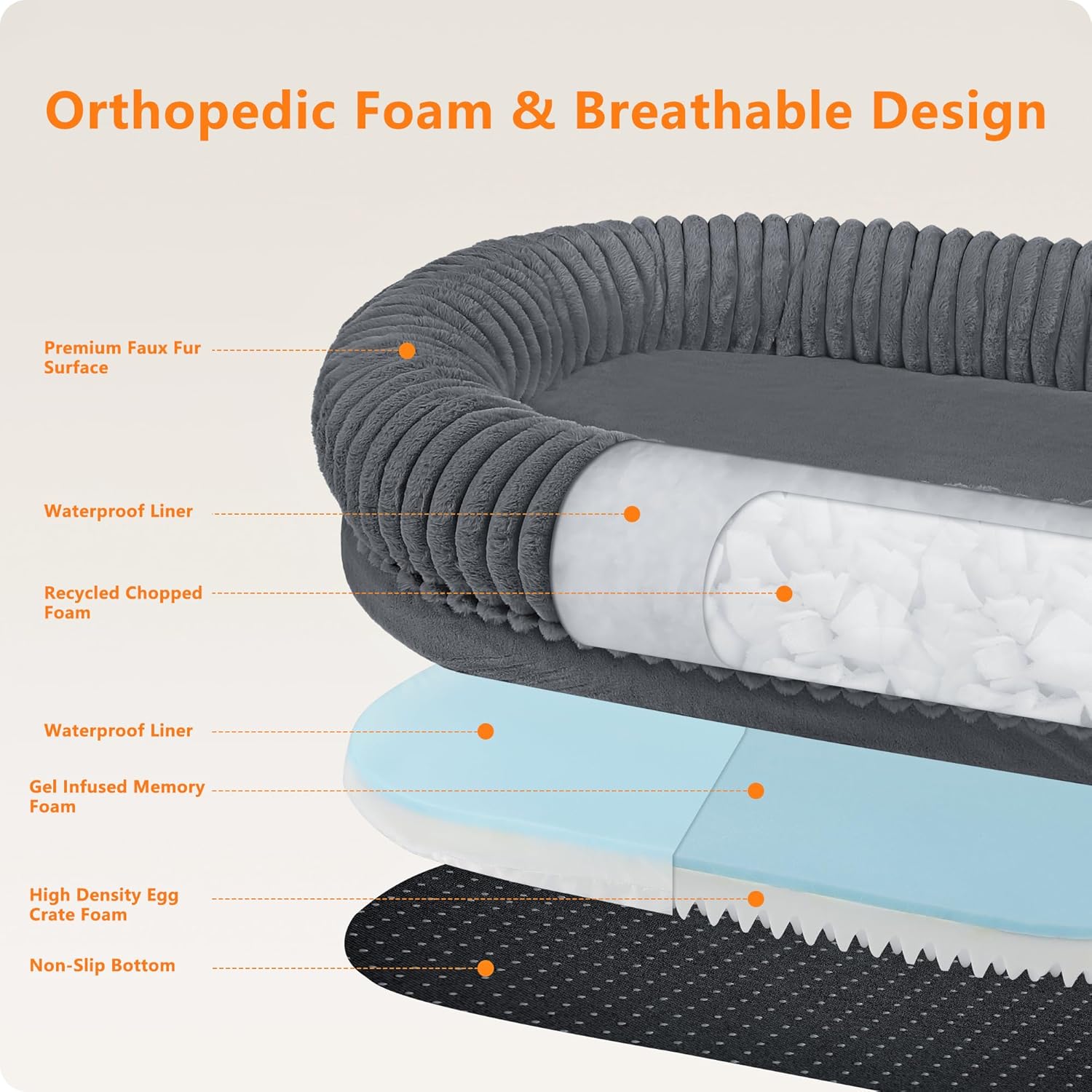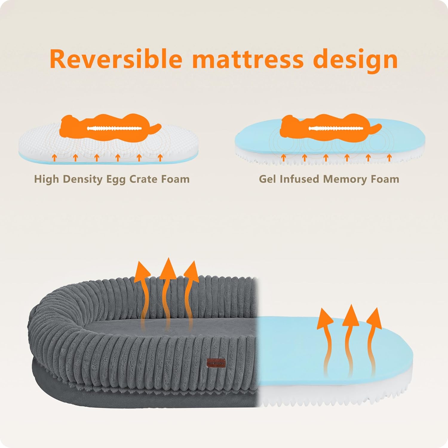 DUAL-SIDED REVERSIBLE PADDING: gel infused memory foam + high density egg crate orthopedic foam for even support and pressure relief. It strikes a good balance between softness and support, which is especially suitable for senior dogs to relieve joint pressure and gives you and your pet high quality sleep experience at the same time.