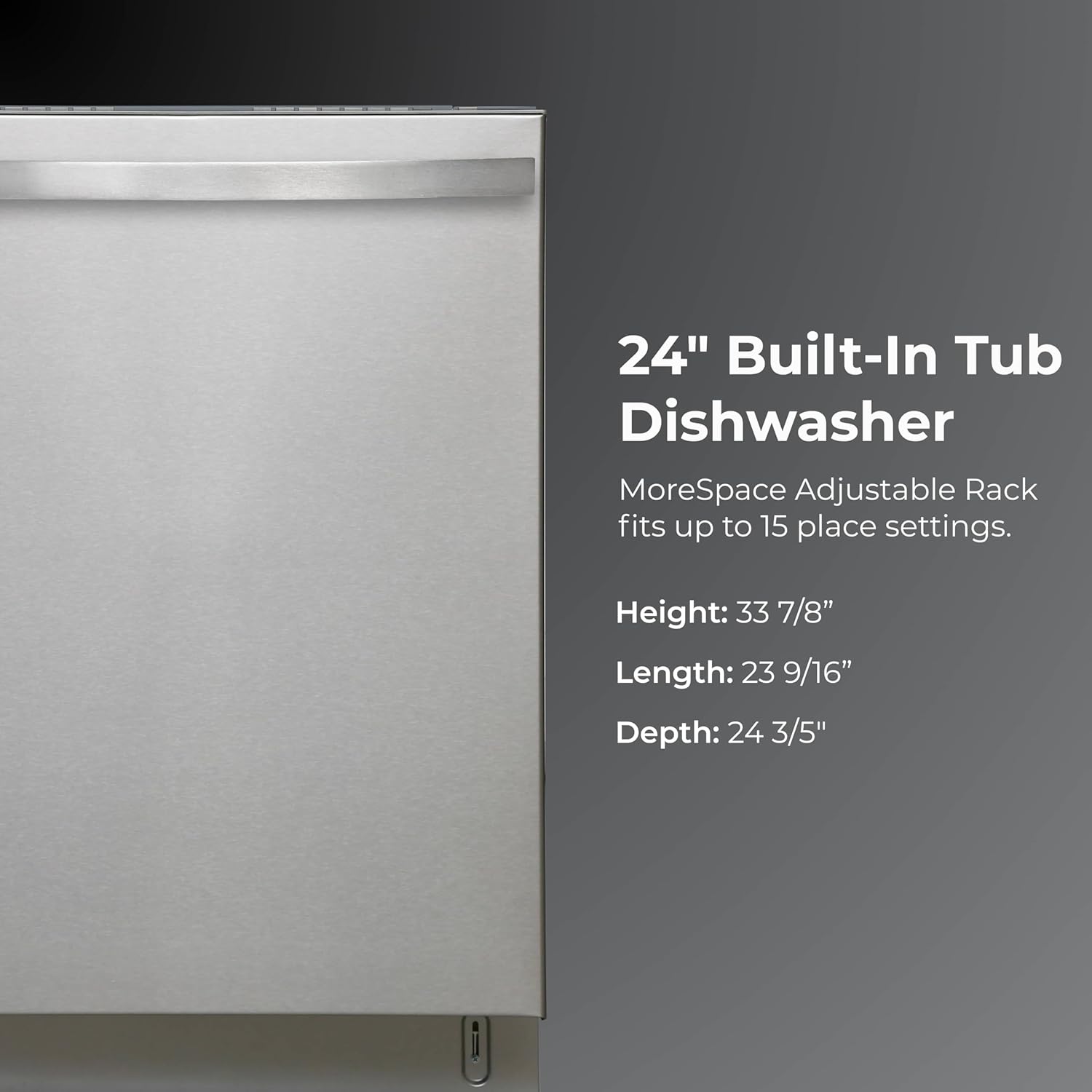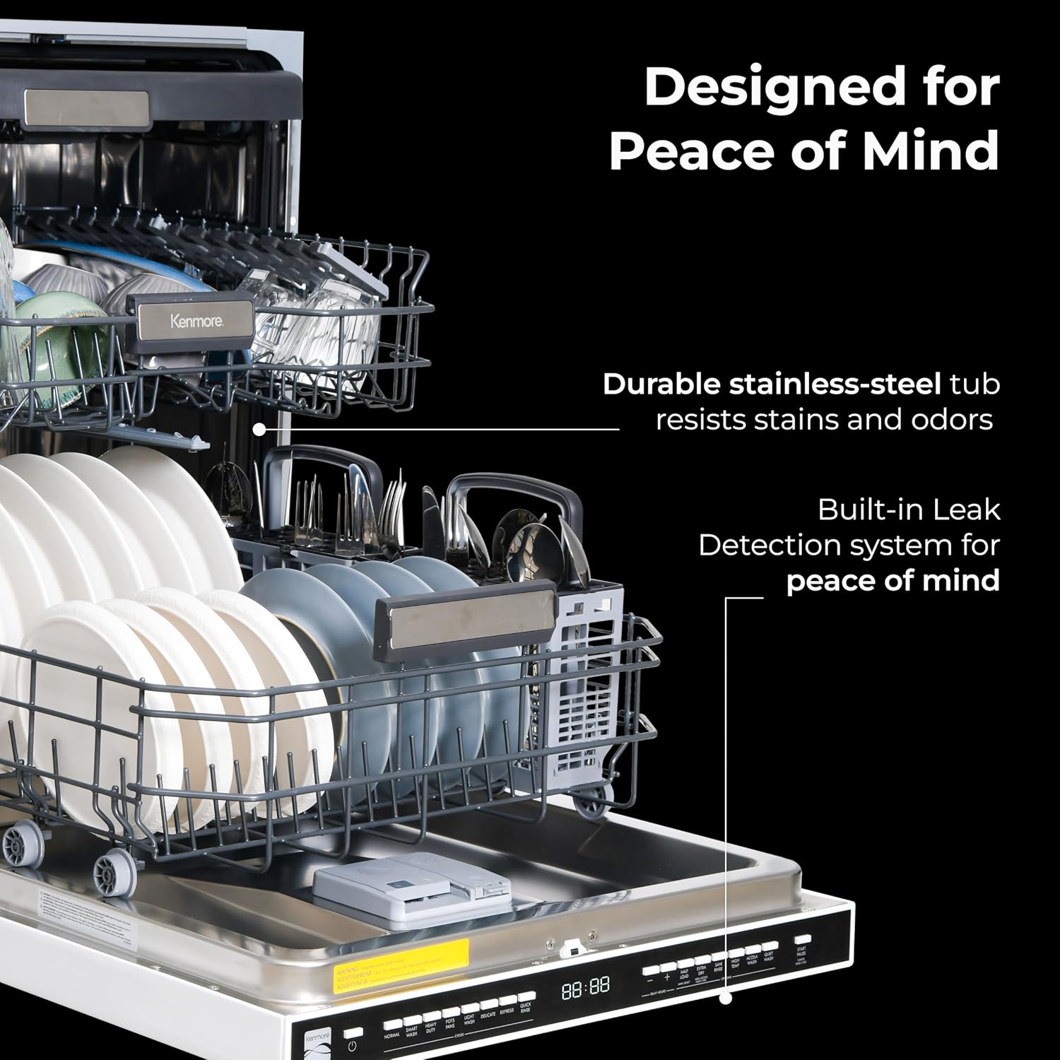 Tackle tough messes with the Kenmore 24″ Built-In Dishwasher. UltraWash Plus uses 3 pressurized spray arms and filtered water for a powerful clean without pre-rinsing. The SmartWash cycle senses soil levels and adjusts settings automatically. Know it’s good and clean with the UL Certified Sani Rinse Option. TurboDry combines a fan and heating element for dry, spot-free dishes. Fit up to 15 place settings with a flexible adjustable rack. Quiet Wash keeps things peaceful, while ENERGY STAR certification helps save water and energy. Built-in leak detection protects your home from water damage.
